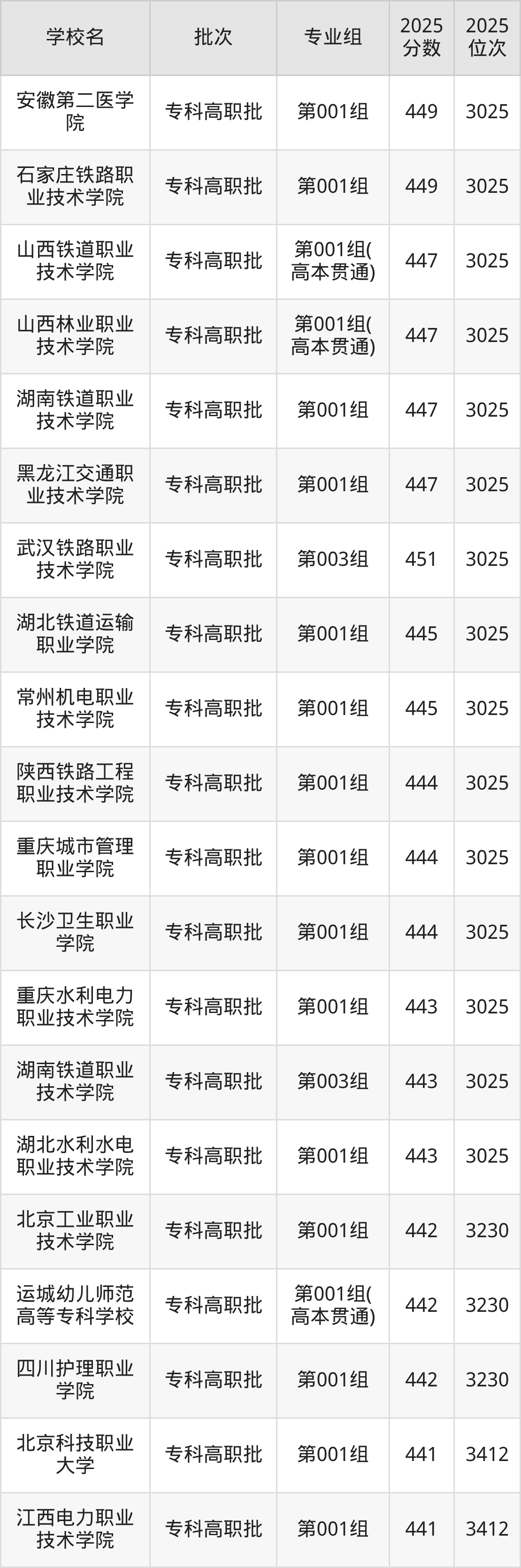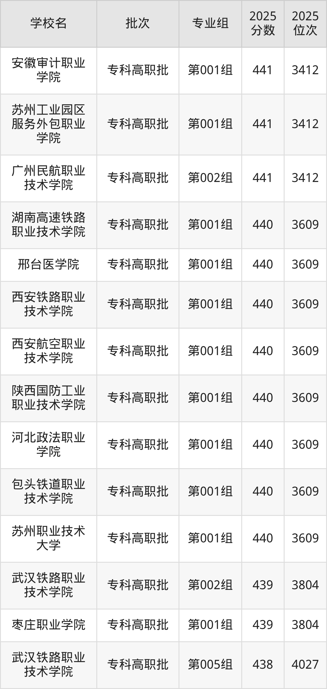 2025年山西高考历史类440分(3413名~3609名)能上的大学有邢台医学院第001组、河北政法职业学院第001组、包头铁道职业技术学院第001组、苏州职业技术大学第001组等。