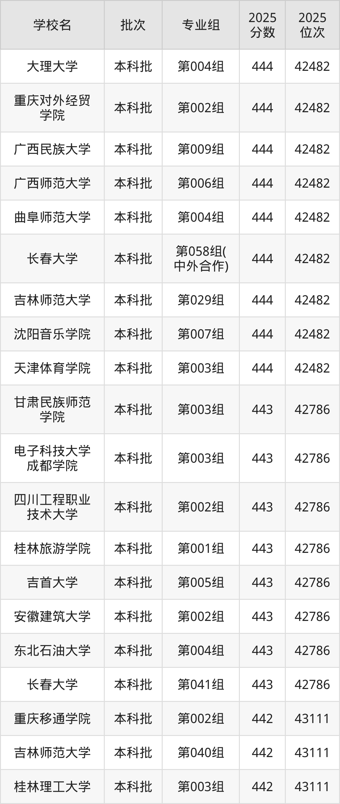 二、吉林442分位次排名能上的大学