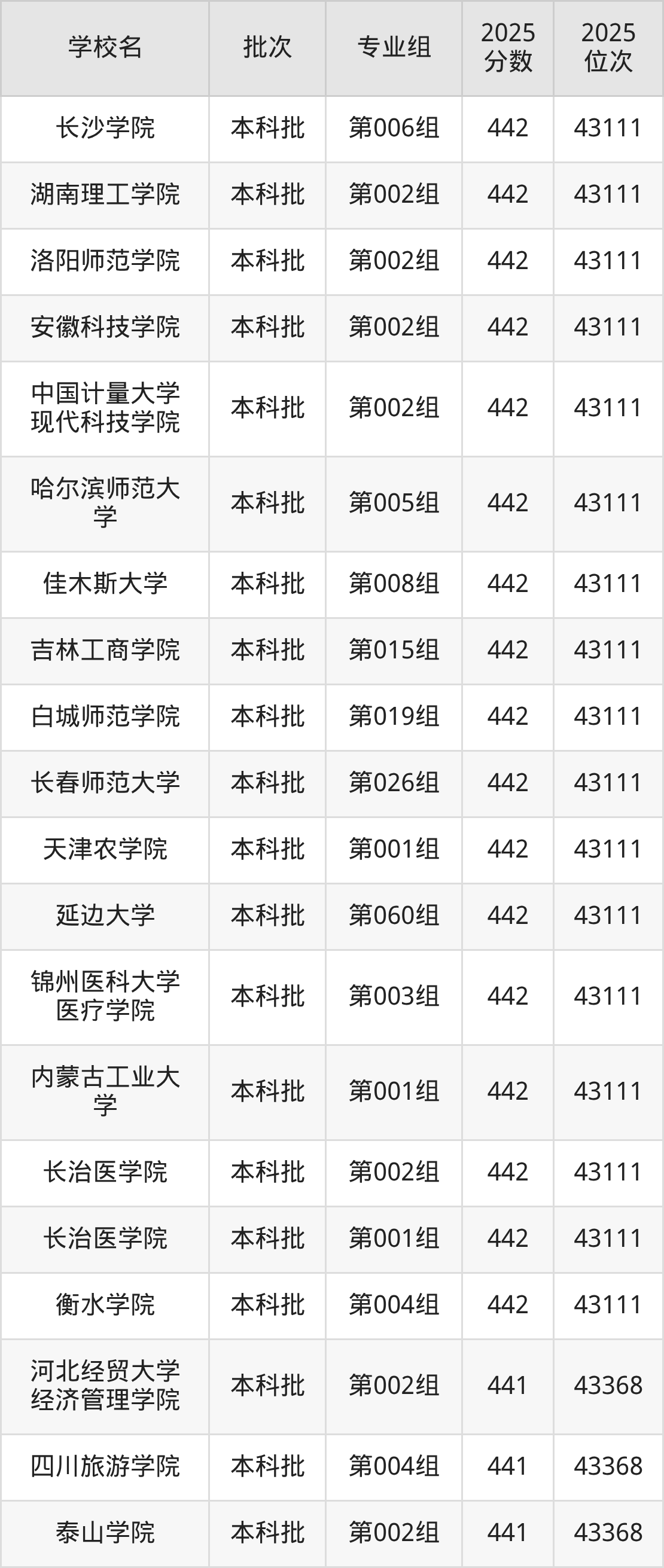 2025年吉林高考物理类442分(42787名~43111名)能上的大学有天津农学院第001组、衡水学院第004组、长治医学院第001组、长治医学院第002组等。