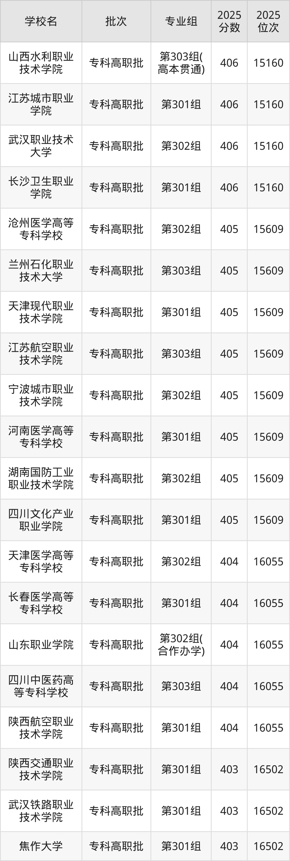 2025年山西高考物理类404分(15610名~16055名)能上的大学有天津医学高等专科学校第302组、长春医学高等专科学校第301组、山东职业学院第302组(合作办学)、四川中医药高等专科学校第303组等。