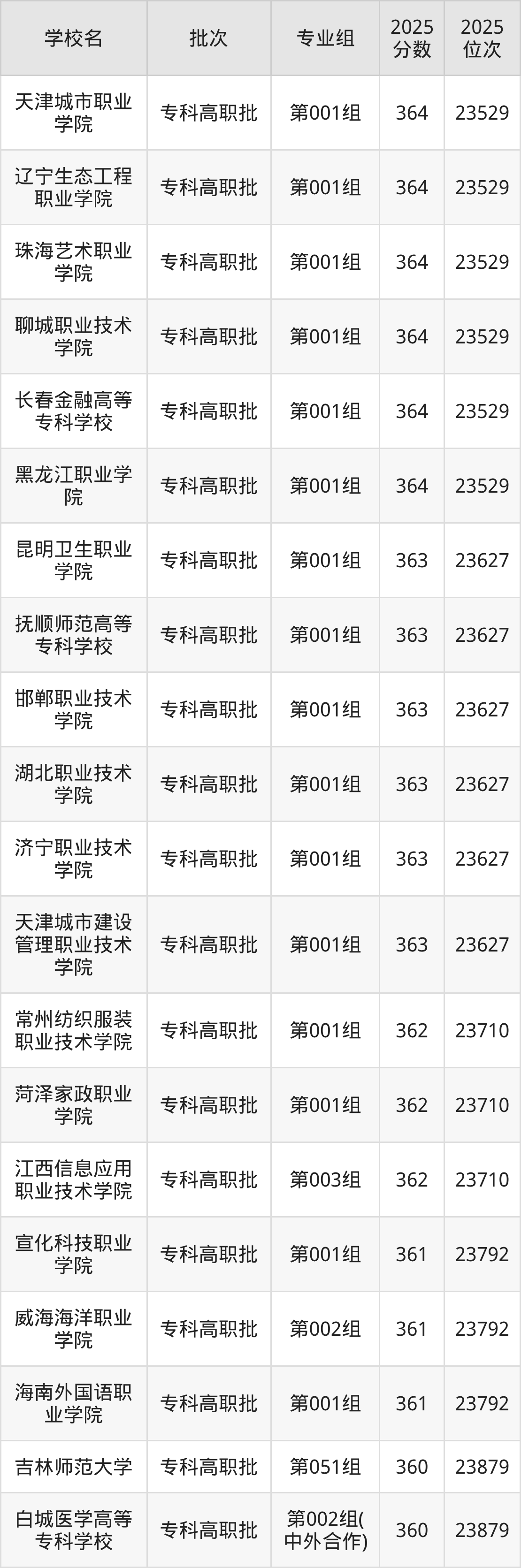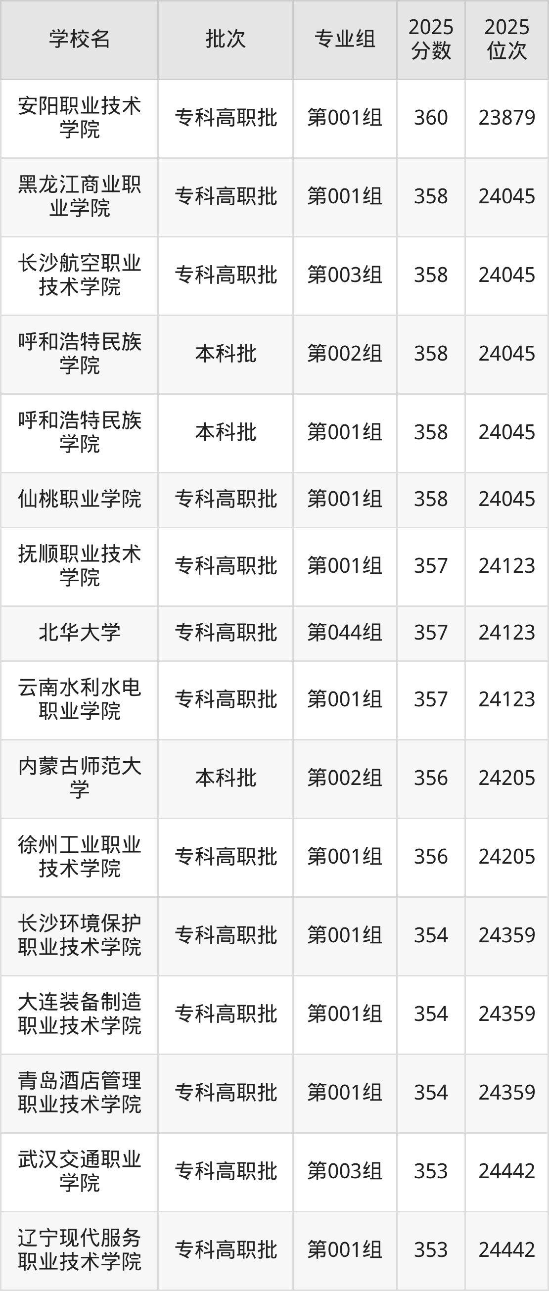 2025年吉林高考历史类358分(23960名~24045名)能上的大学有呼和浩特民族学院第001组、呼和浩特民族学院第002组、黑龙江商业职业学院第001组、仙桃职业学院第001组等。