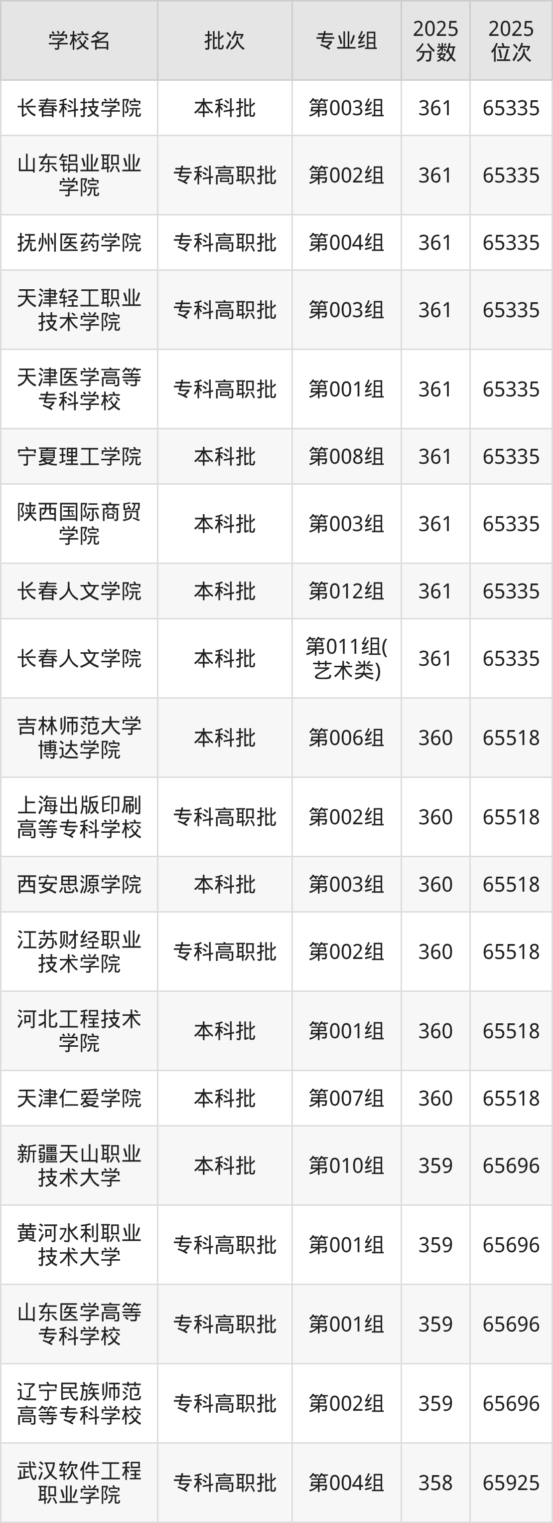 2025年吉林高考物理类358分(65697名~65925名)能上的大学有长春工业大学人文信息学院第003组、长春电子科技学院第003组、广西外国语学院第006组、丽江文化旅游学院第002组等。