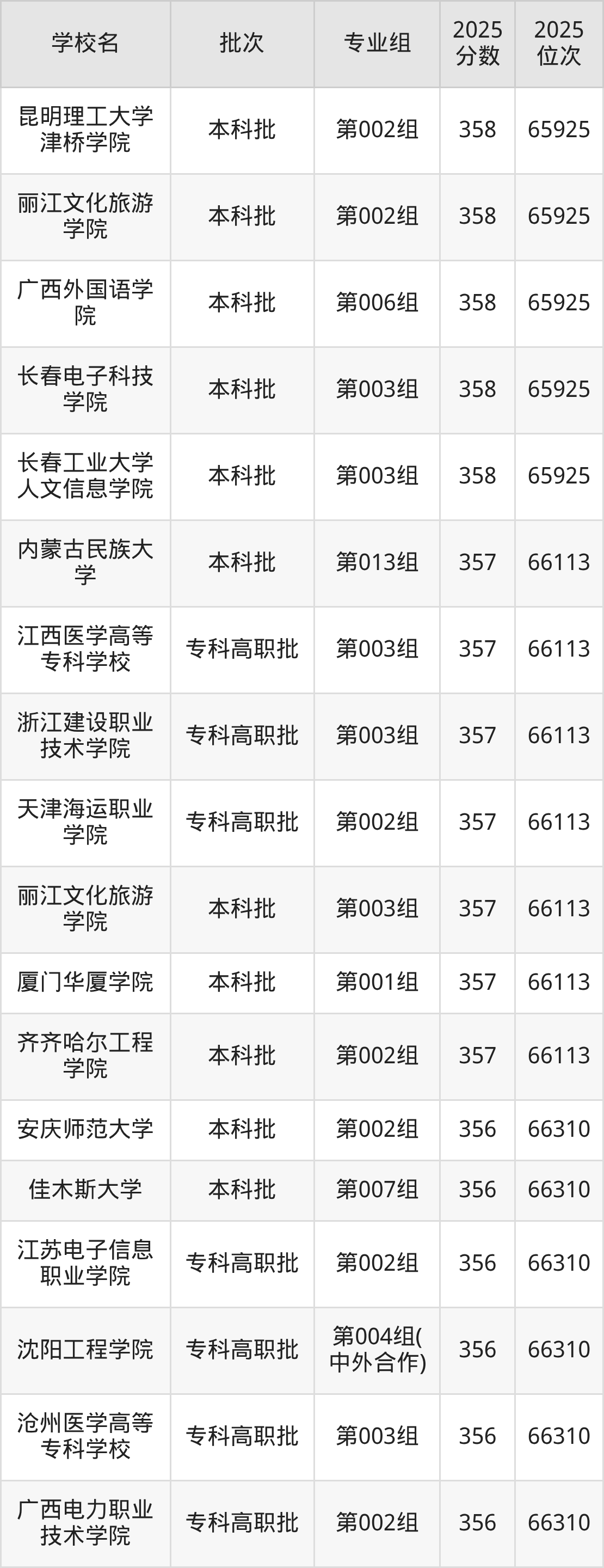吉林高考358分:历史类排名24045位、物理类排名65925位。该分数位次对应能上的大学历史类有呼和浩特民族学院第001组、呼和浩特民族学院第002组;物理类有长春工业大学人文信息学院第003组、长春电子科技学院第003组,更多名单如下文所示,2026届考生可参考。