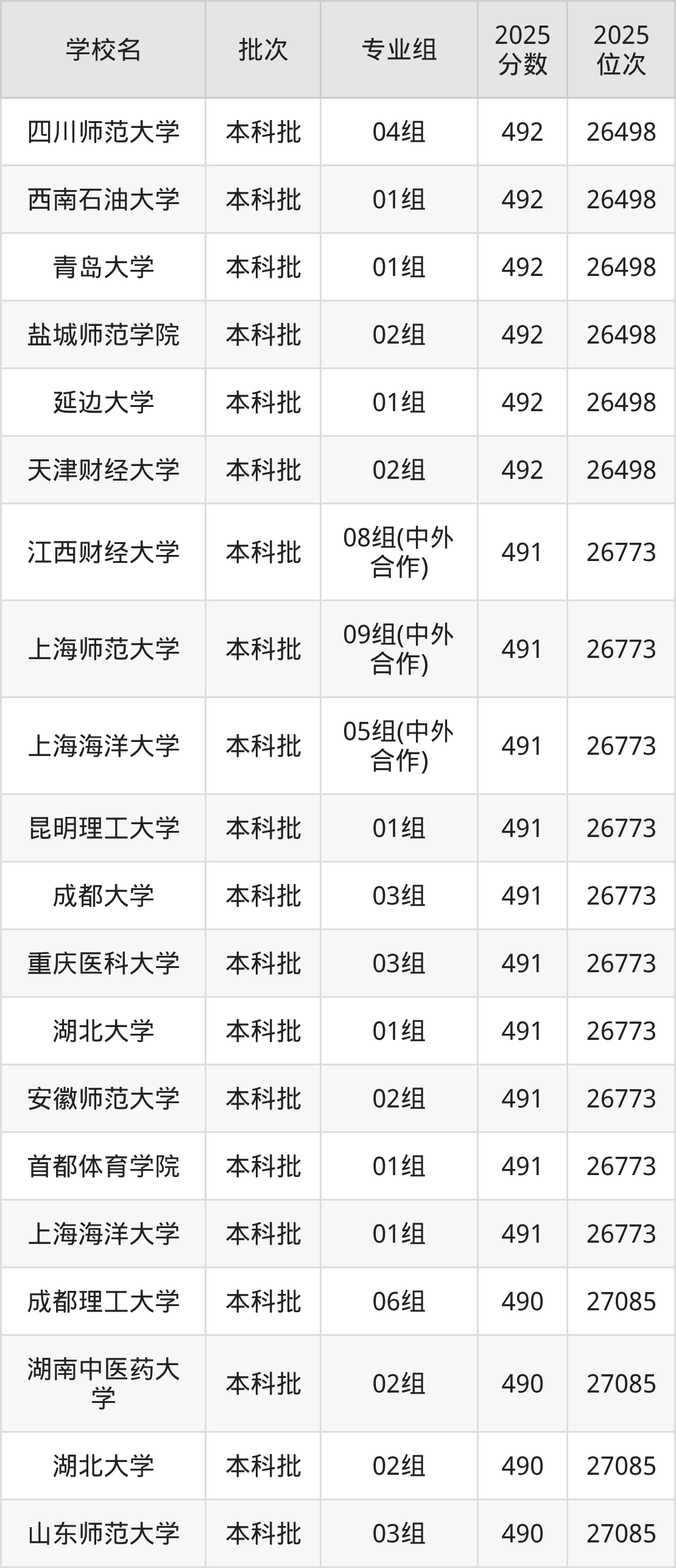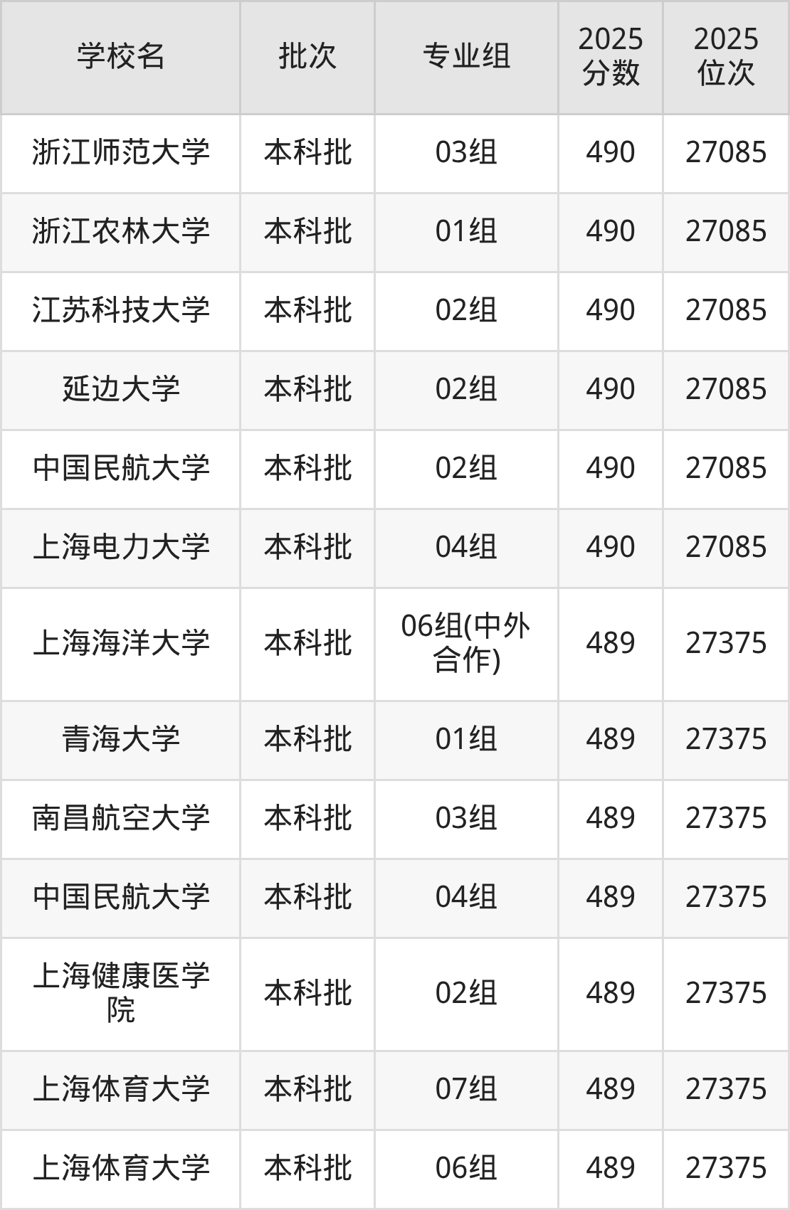 2025年上海高考490分(26774名~27085名)能上的大学有上海电力大学04组、中国民航大学02组、延边大学02组、江苏科技大学02组等。