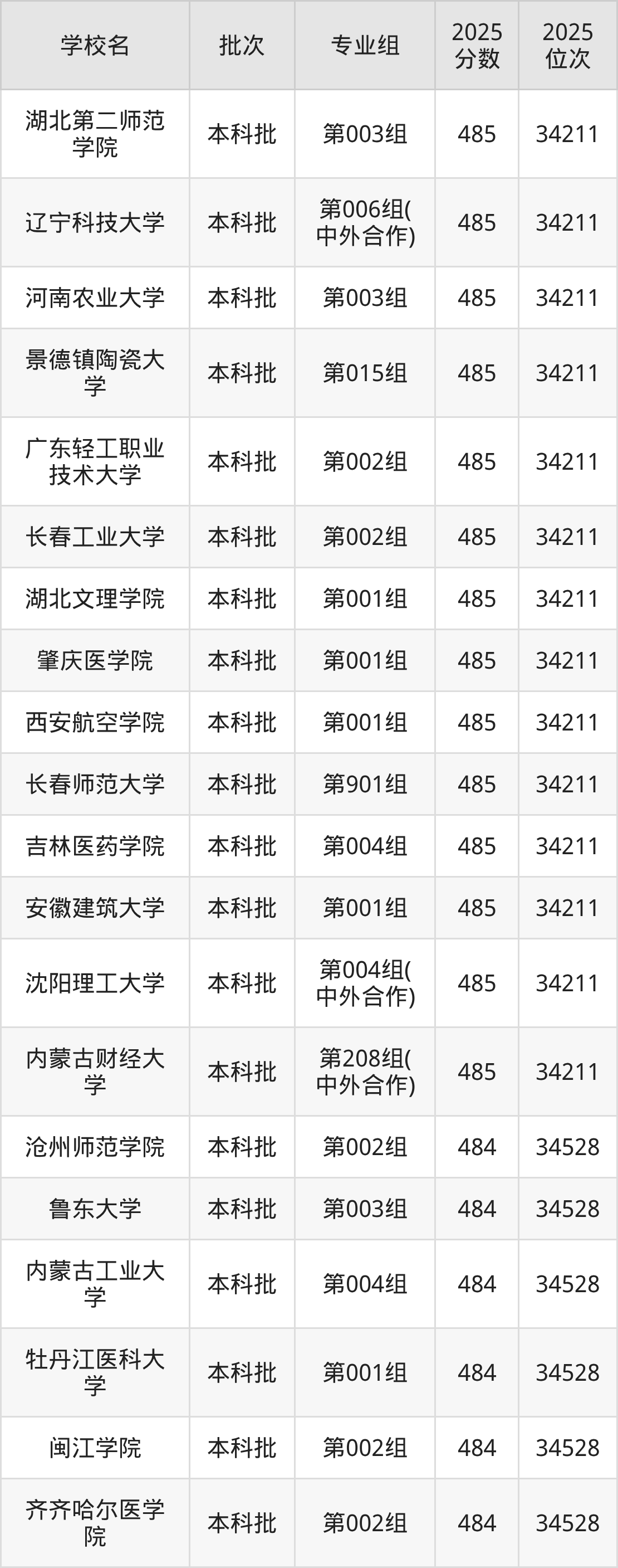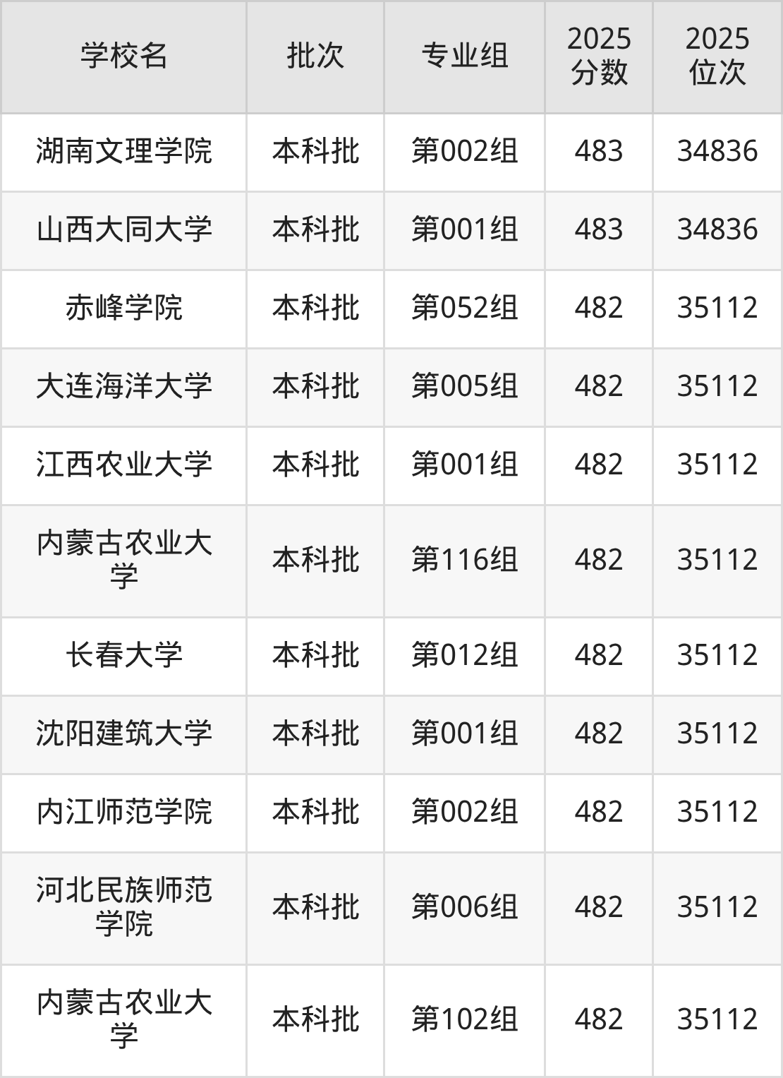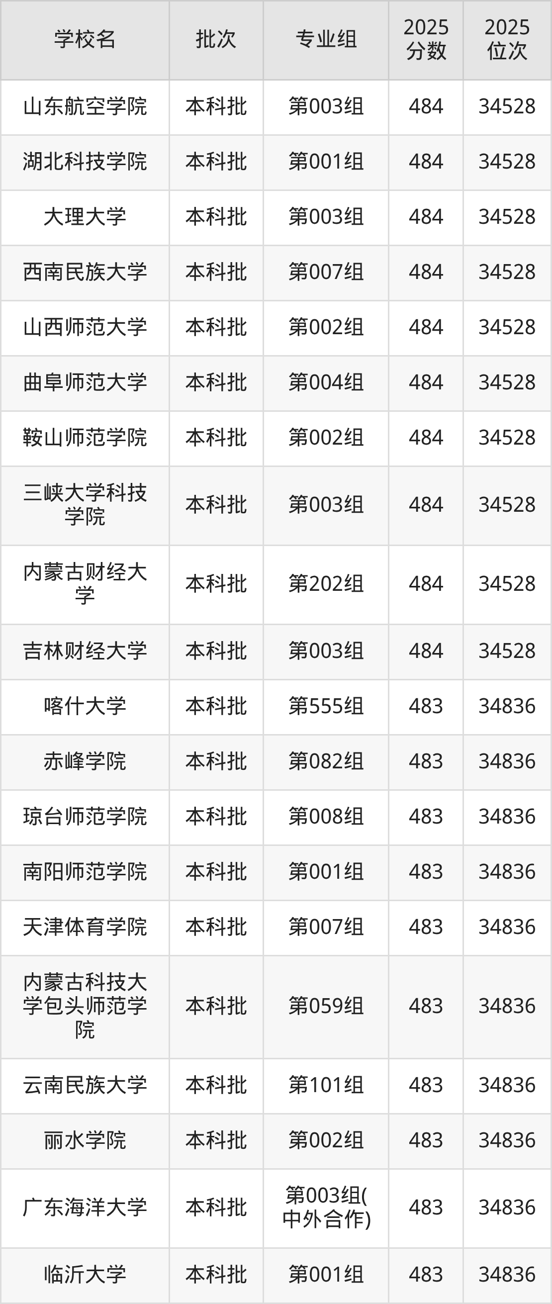 2025年内蒙古高考物理类483分(34529名~34836名)能上的大学有山西大同大学第001组、内蒙古科技大学包头师范学院第059组、临沂大学第001组、云南民族大学第101组等。