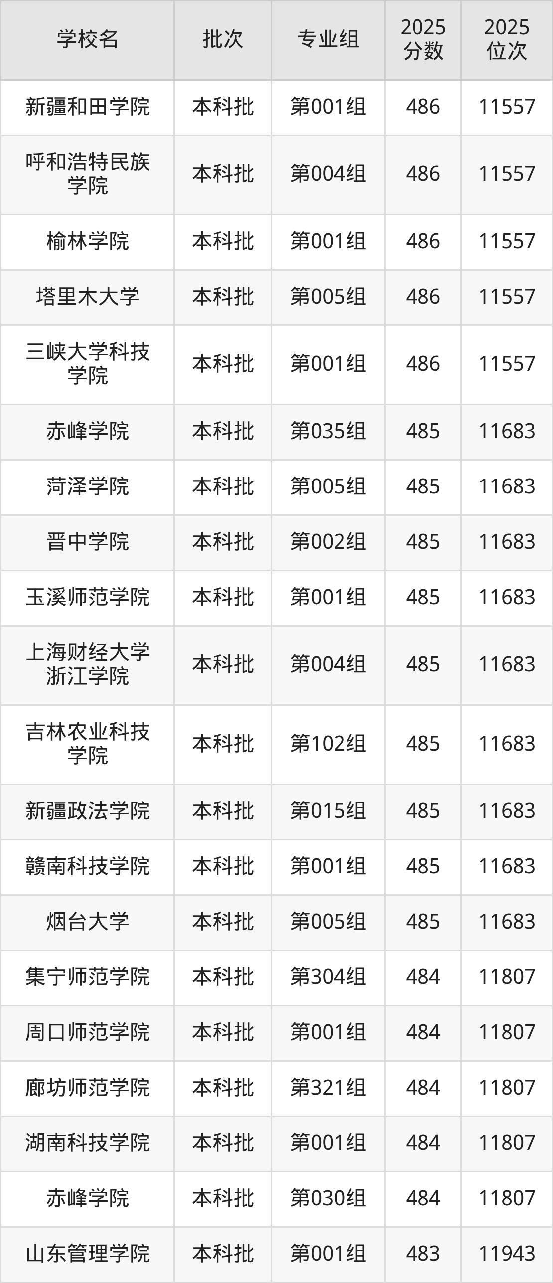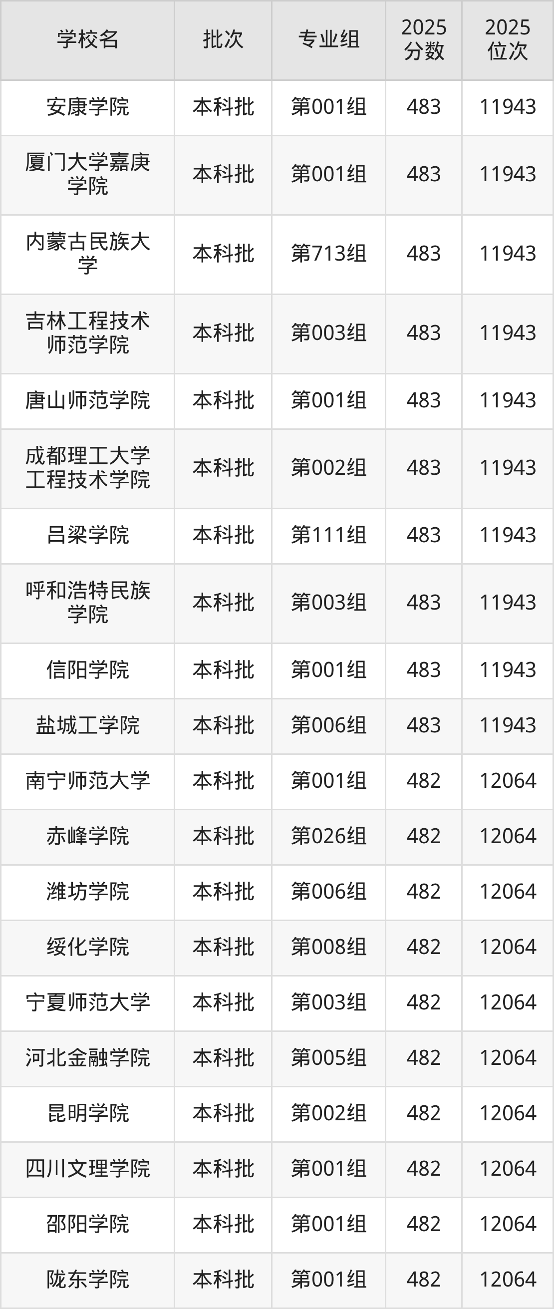 2025年内蒙古高考历史类483分(11808名~11943名)能上的大学有呼和浩特民族学院第003组、内蒙古民族大学第713组、信阳学院第001组、安康学院第001组等。