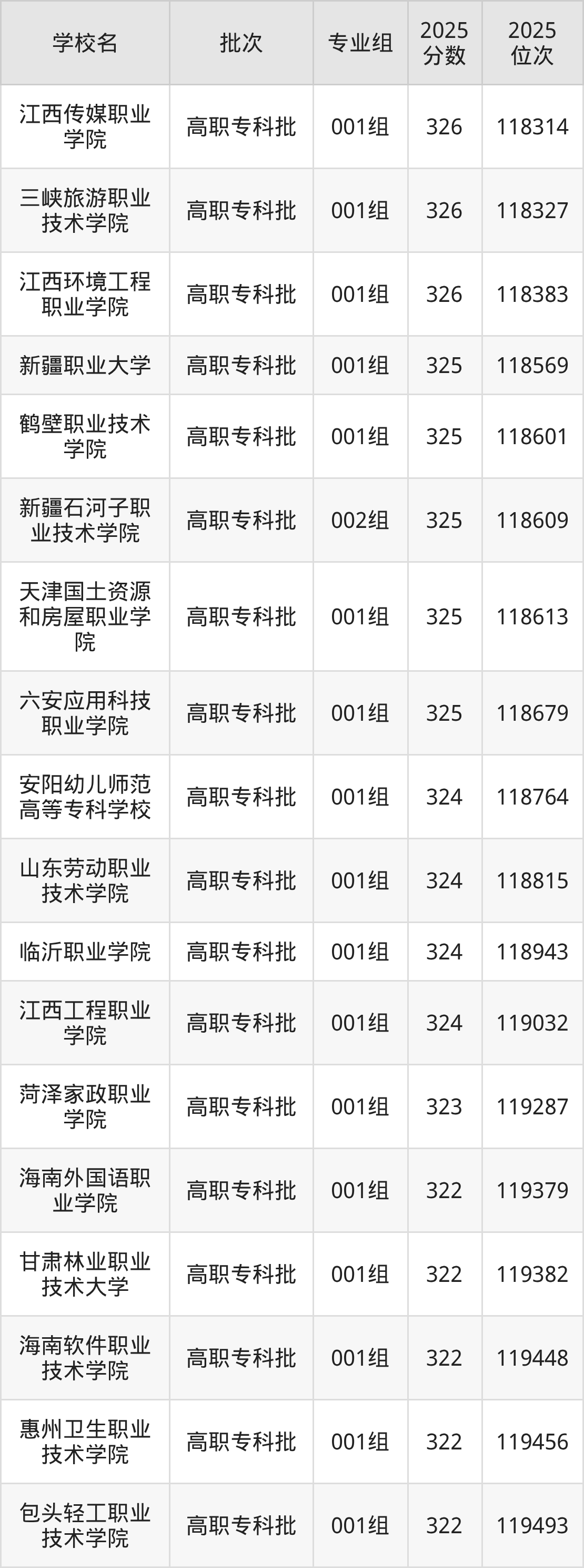 2025年安徽高考历史类324分(118707名~119047名)能上的大学有安阳幼儿师范高等专科学校001组、江西工程职业学院001组、临沂职业学院001组、山东劳动职业技术学院001组。