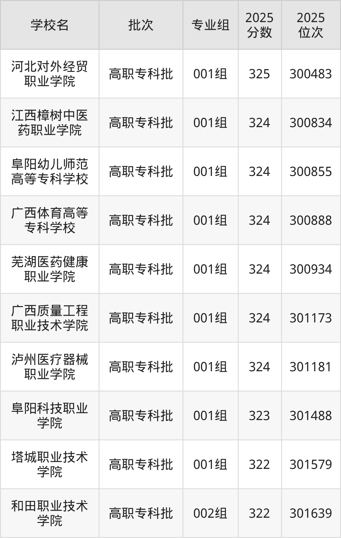 2025年安徽高考物理类324分(300823名~301213名)能上的大学有广西体育高等专科学校001组、广西质量工程职业技术学院001组、江西樟树中医药职业学院001组、泸州医疗器械职业学院001组等。