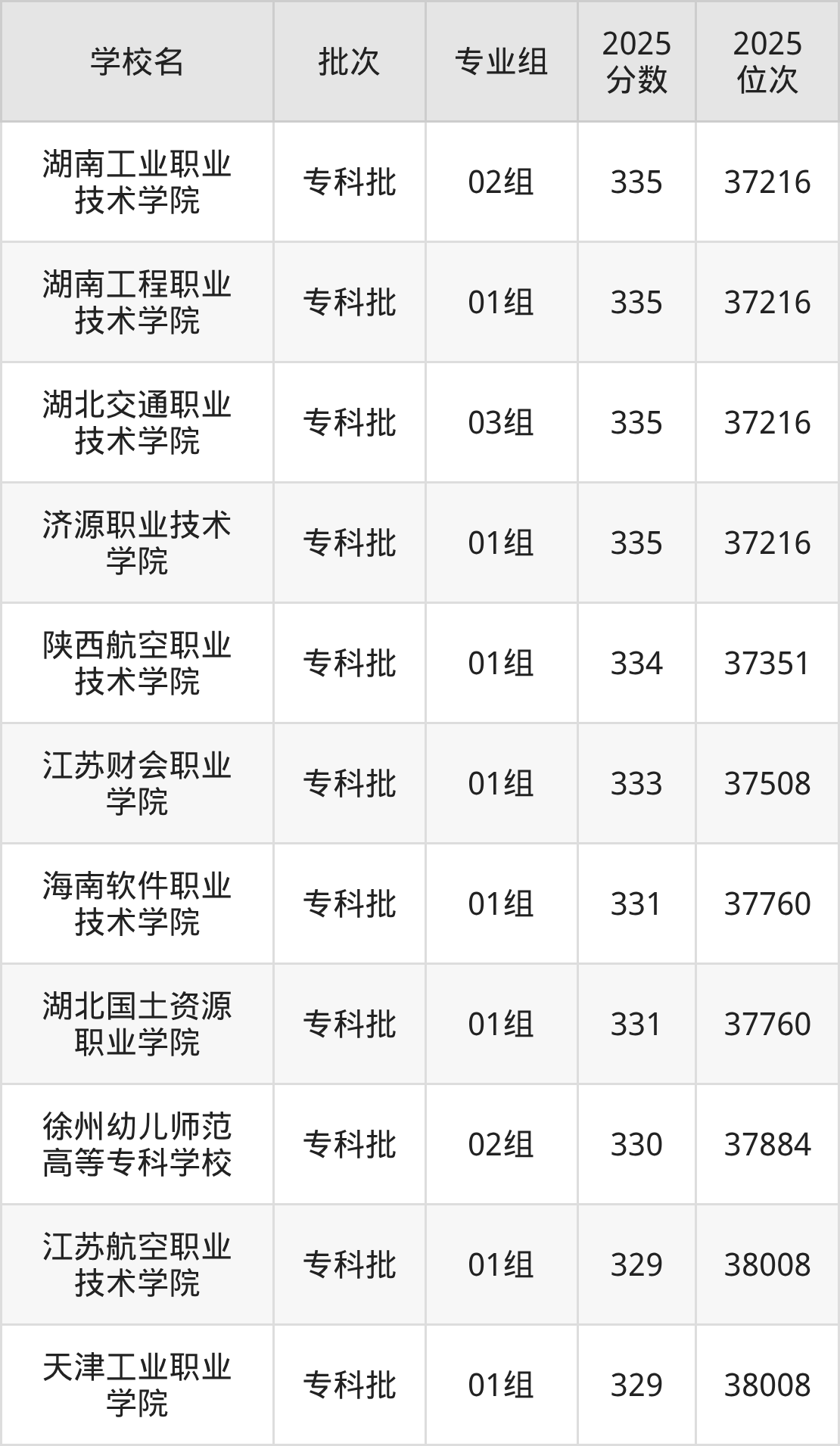 2025年江苏高考历史类332分(37509名~37633名)录取位次低于该区间(较稳妥)的有海南软件职业技术学院01组(37760名)、湖北国土资源职业学院01组(37760名)等;录取位次高于该区间(可冲)的有江苏财会职业学院01组(37508名)、陕西航空职业技术学院01组(37351名)等。