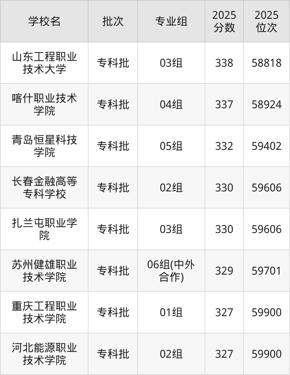 另外录取位次低于该区间(较稳妥)的有扎兰屯职业学院03组(59606名)、长春金融高等专科学校02组(59606名)等;录取位次高于该区间(可冲)的有喀什职业技术学院04组(58924名)、山东工程职业技术大学03组(58818名)等。