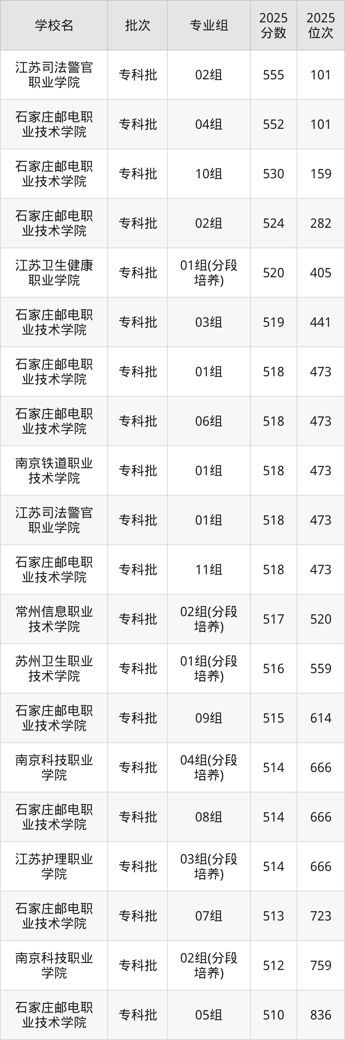 另外录取位次低于该区间(较稳妥)的有江苏司法警官职业学院04组(1195名)、石家庄邮电职业技术学院23组(1357名)等;录取位次高于该区间(可冲)的有南京中医药大学19组(中外合作)(泰州校区)(132082名)、江苏师范大学12组(中外合作)(132082名)等。