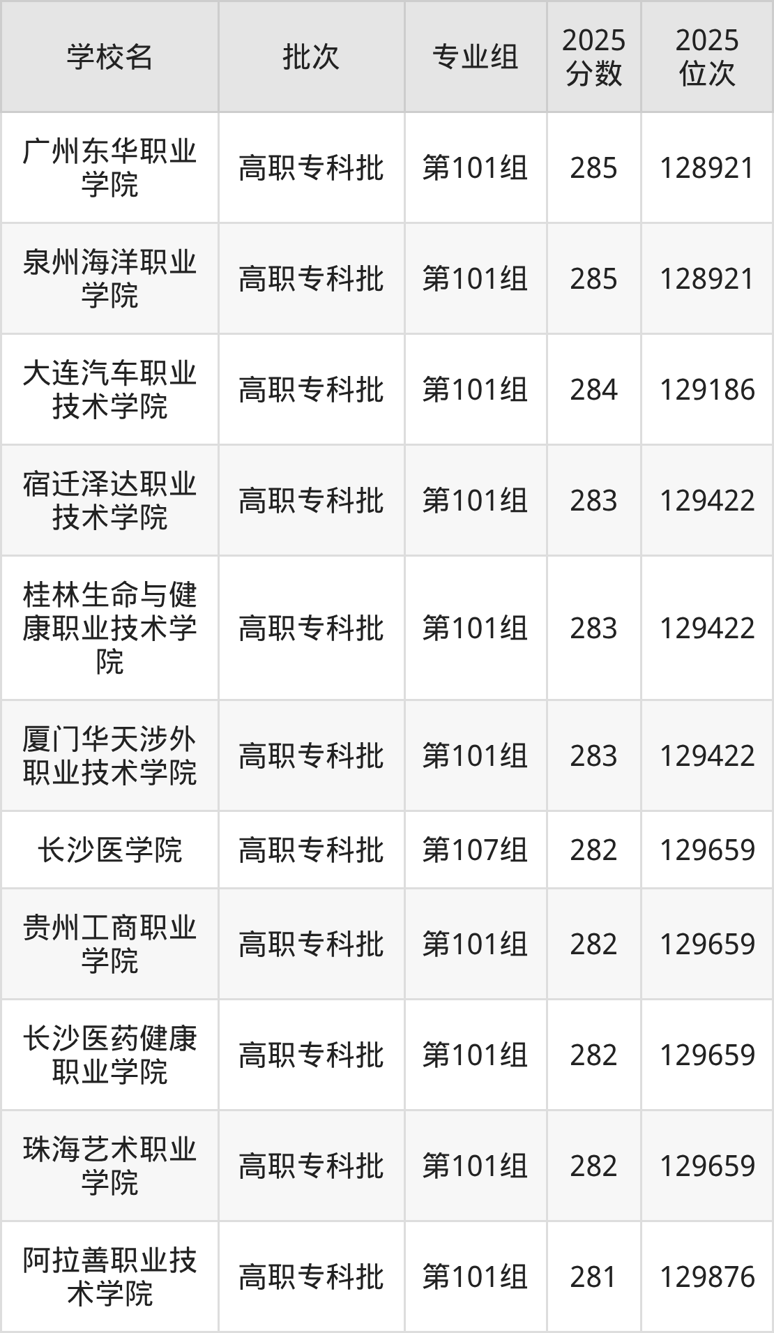 2025年湖南高考历史类283分(129187名~129422名)能上的大学有厦门华天涉外职业技术学院第101组、桂林生命与健康职业技术学院第101组、宿迁泽达职业技术学院第101组。