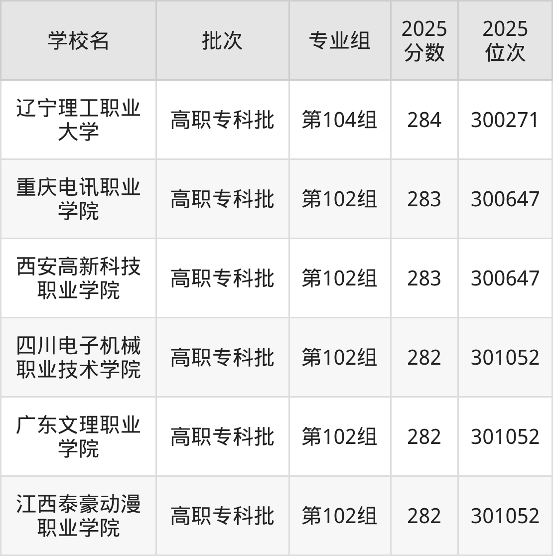 2025年湖南高考物理类283分(300272名~300647名)能上的大学有重庆电讯职业学院第102组、西安高新科技职业学院第102组。