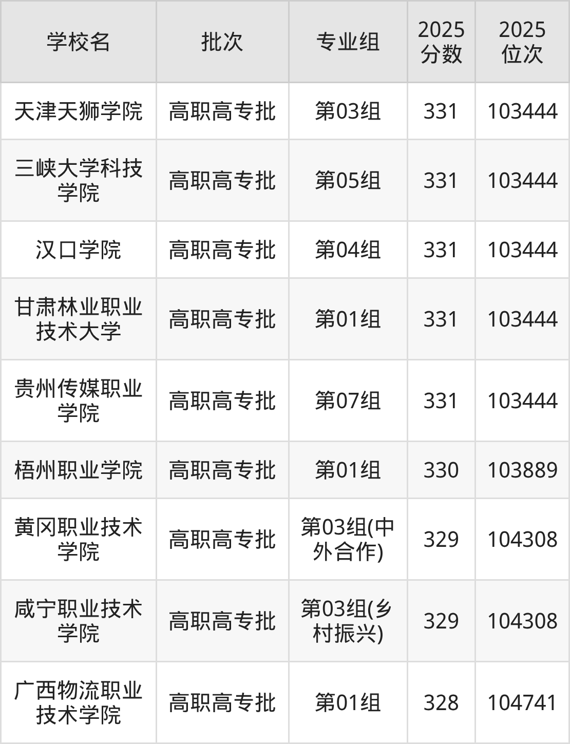 2025年湖北高考历史类329分(103890名~104308名)能上的大学有咸宁职业技术学院第03组(乡村振兴)、黄冈职业技术学院第03组(中外合作)。