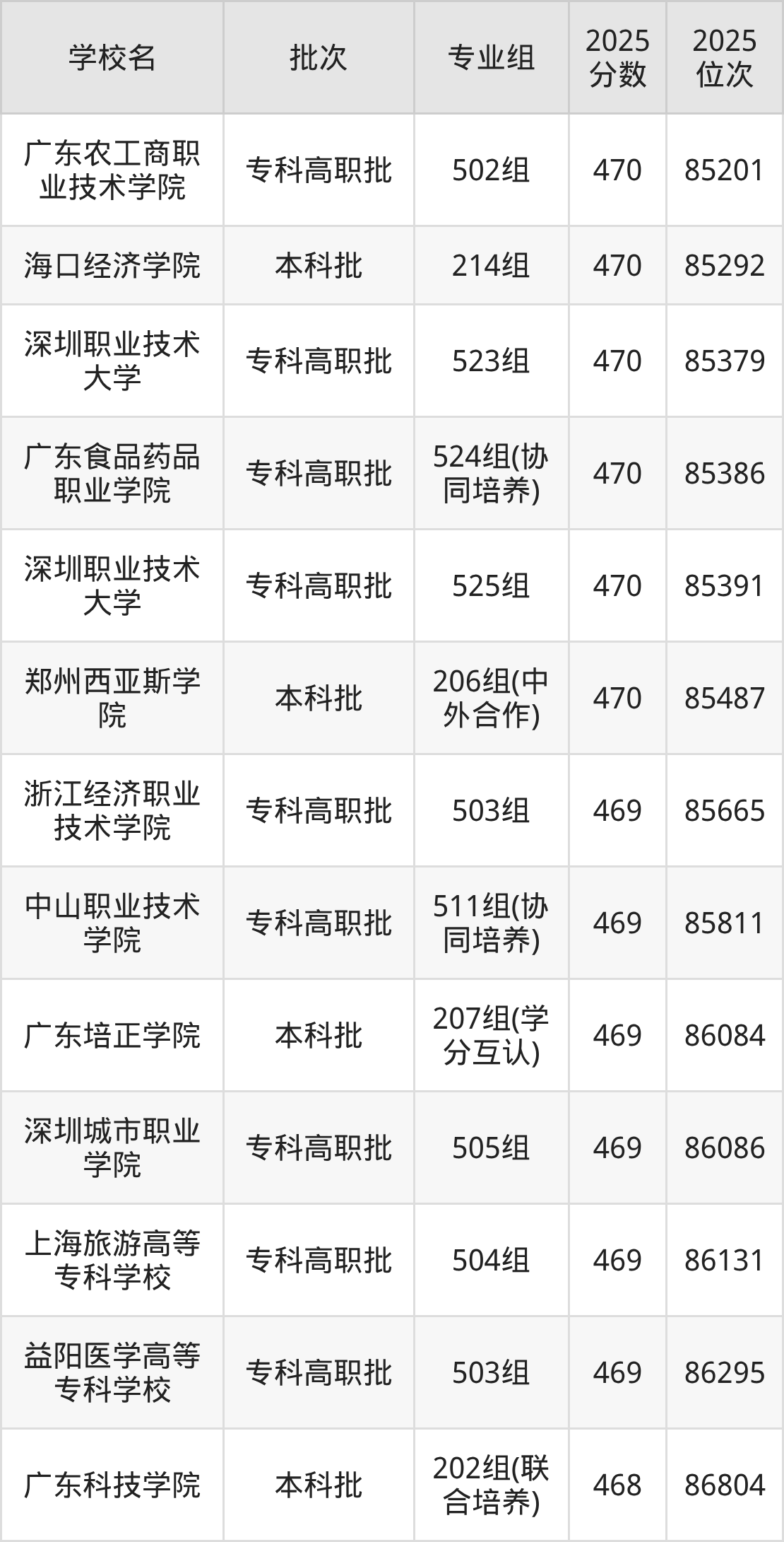 2025年广东高考历史类469分(85556名~86536名)能上的大学有广东培正学院207组(学分互认)、上海旅游高等专科学校504组、浙江经济职业技术学院503组、中山职业技术学院511组(协同培养)等。