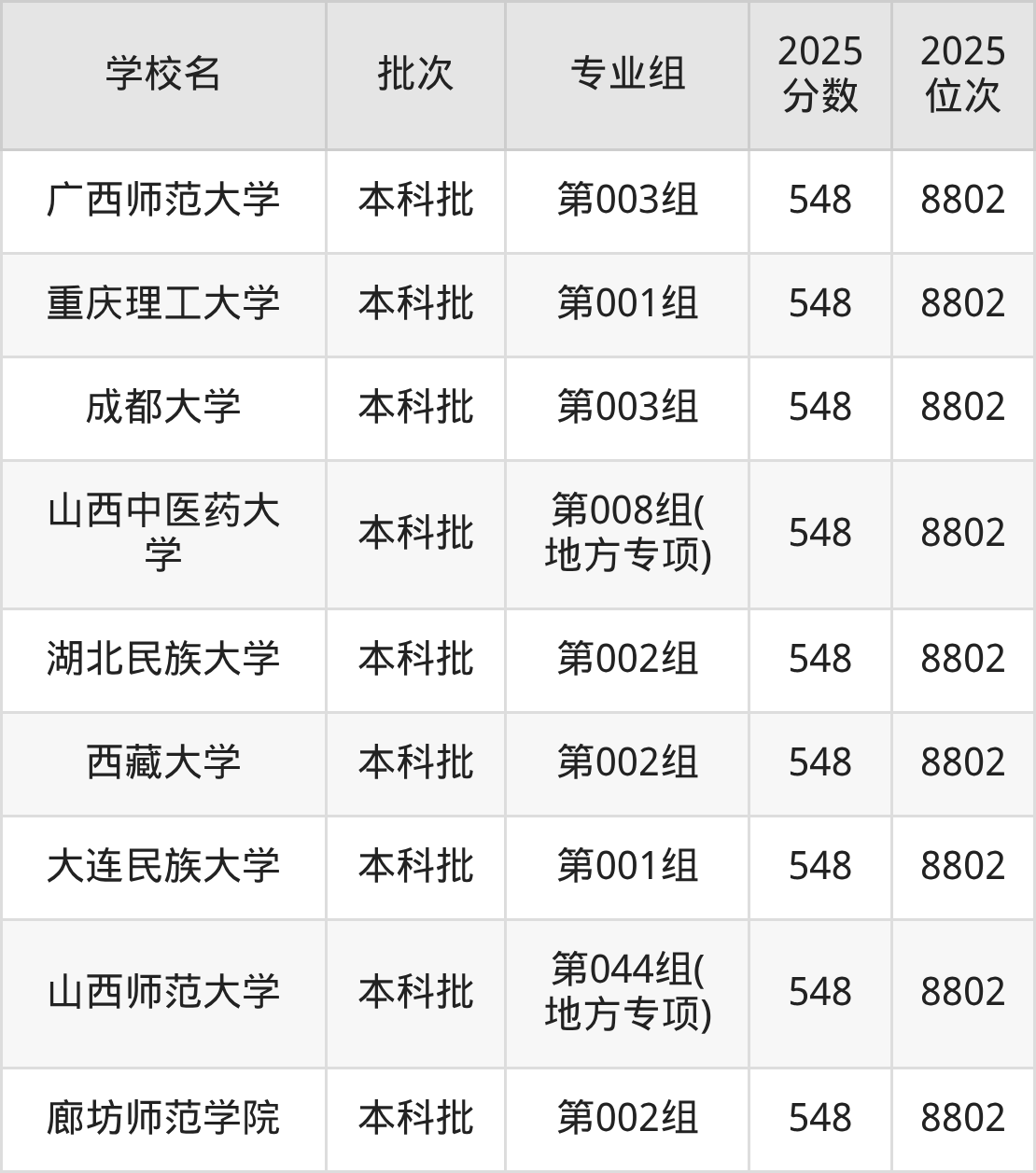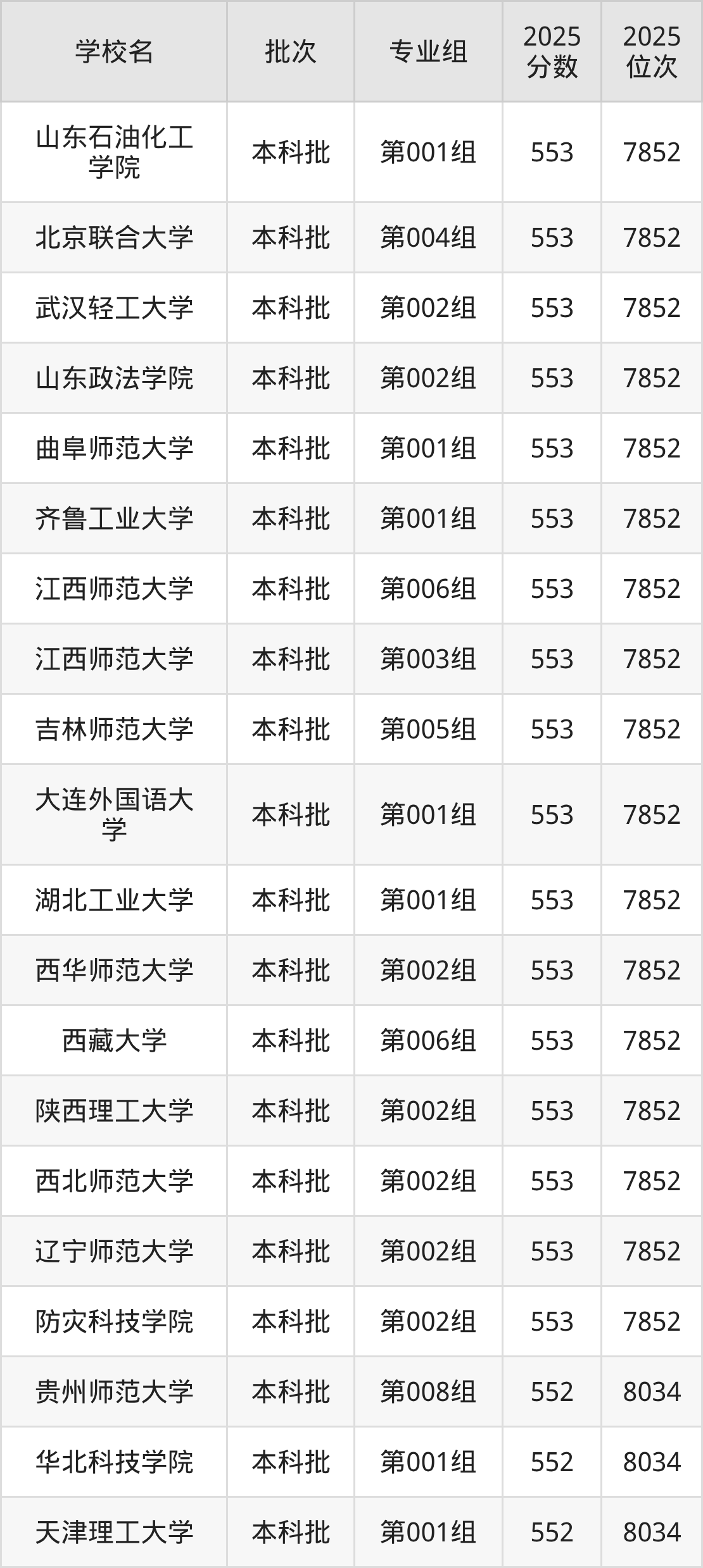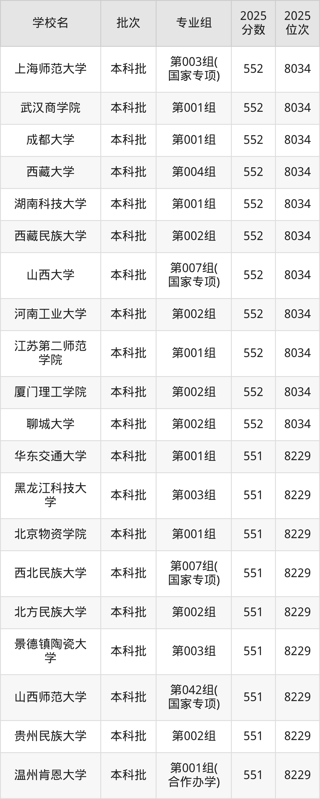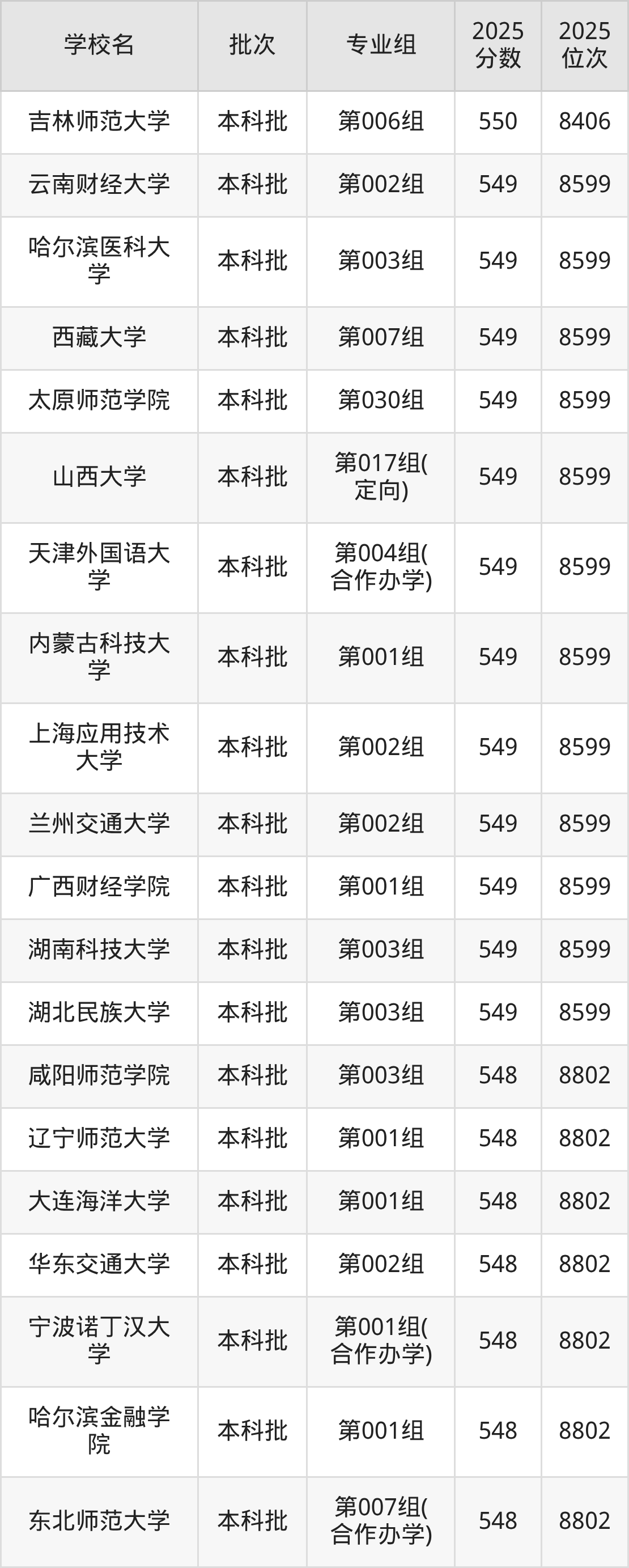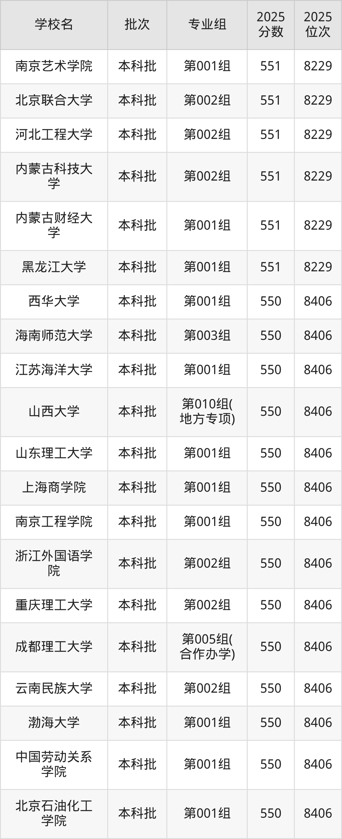 2025年山西高考历史类550分(8230名~8406名)能上的大学有北京石油化工学院第001组、中国劳动关系学院第001组、渤海大学第001组、吉林师范大学第006组等。