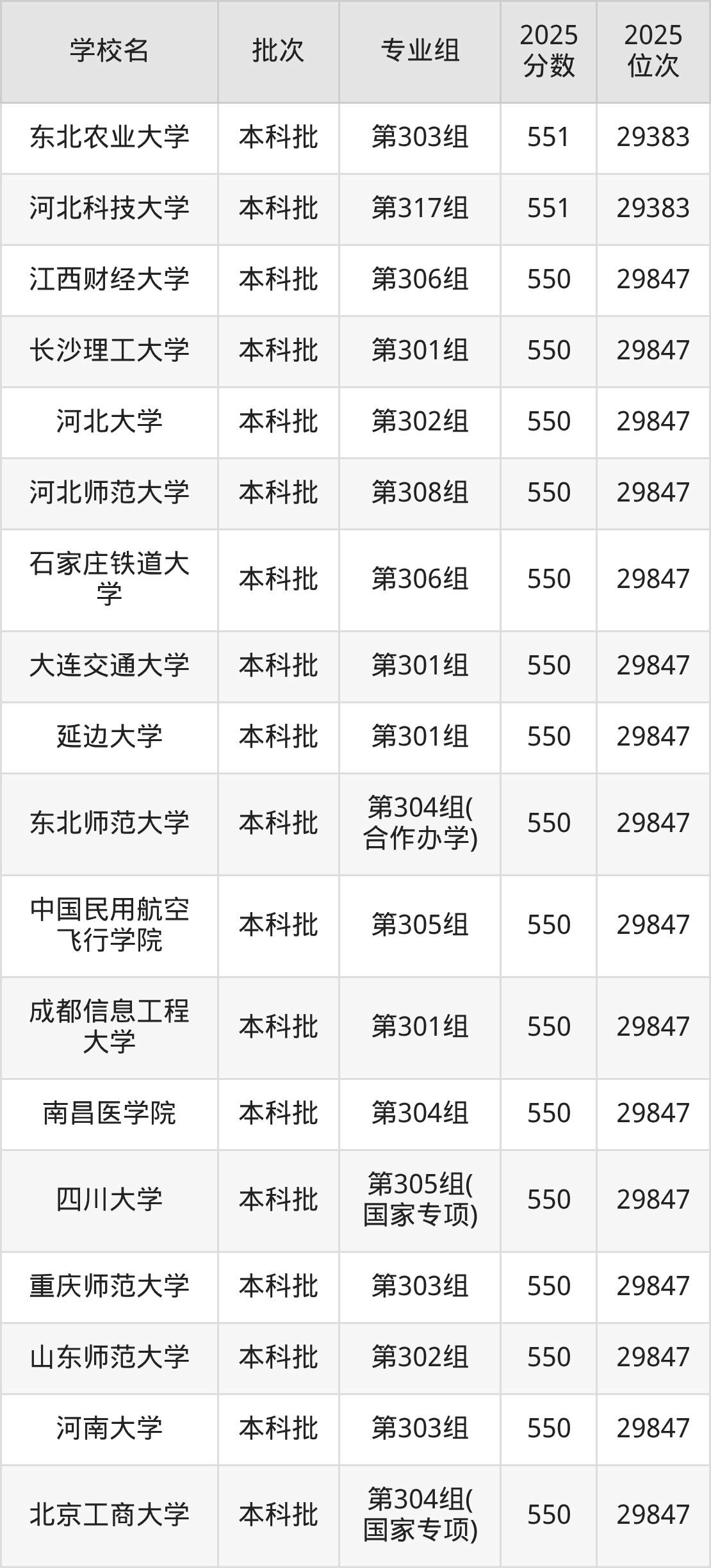 2025年山西高考物理类550分(29384名~29847名)能上的大学有北京工商大学第304组(国家专项)、河北大学第302组、河北师范大学第308组、石家庄铁道大学第306组等。