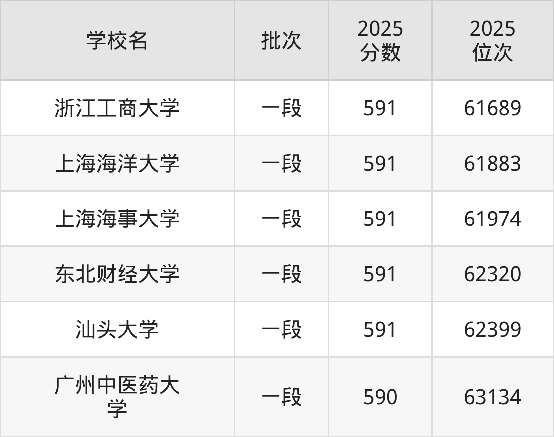 2025年浙江高考591分(61620名~62803名)能上的大学有浙江工商大学、上海海洋大学、东北财经大学、汕头大学等。