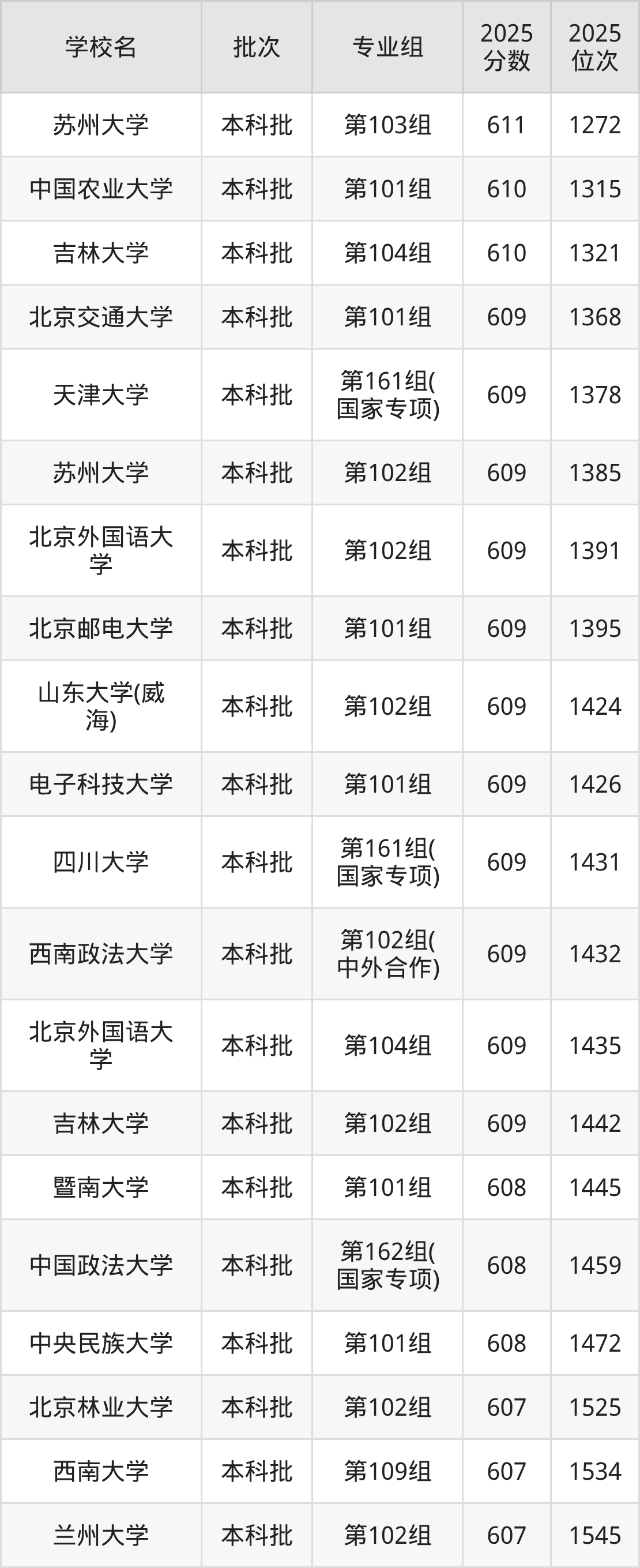 由于高考录取分数线历年波动较大,因此本文以该分数对应的位次排名为大家整理能上的大学名单。