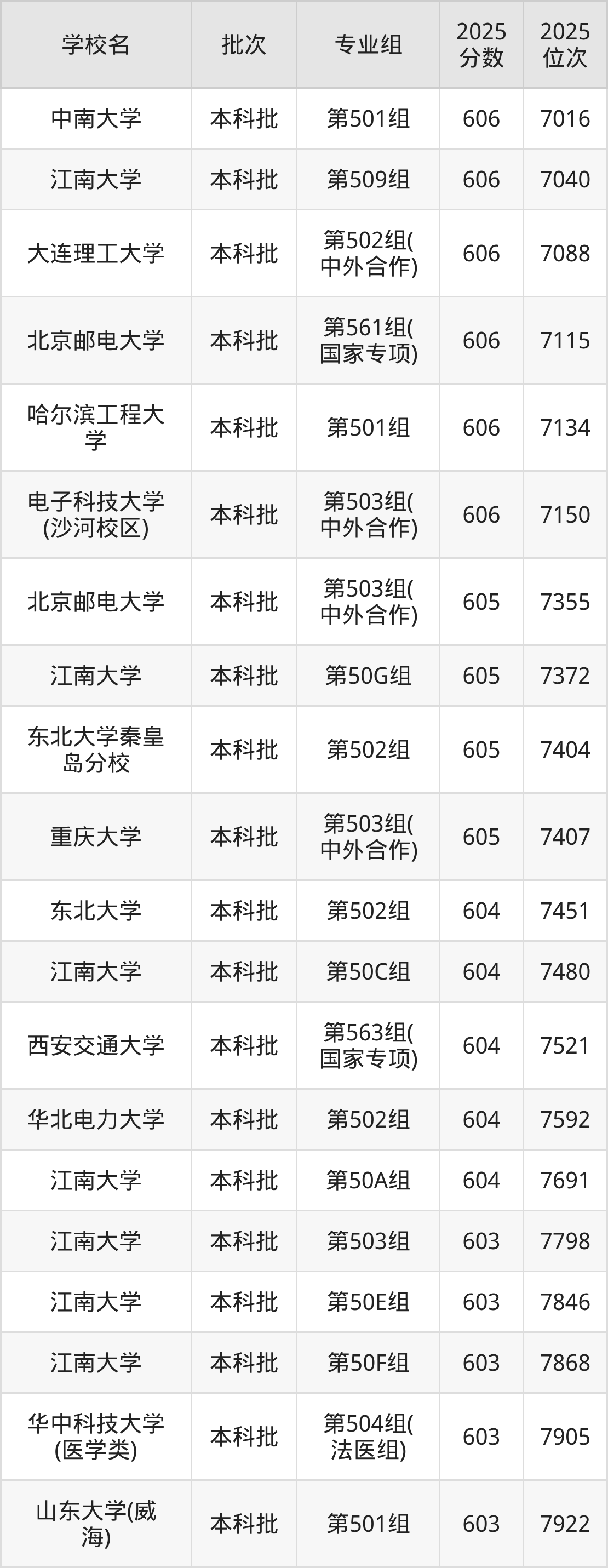另外录取位次低于该区间(较稳妥)的有江南大学第503组(7798名)、江南大学第50E组(7846名)等;录取位次高于该区间(可冲)的有重庆大学第503组(中外合作)(7407名)、东北大学秦皇岛分校第502组(7404名)等。