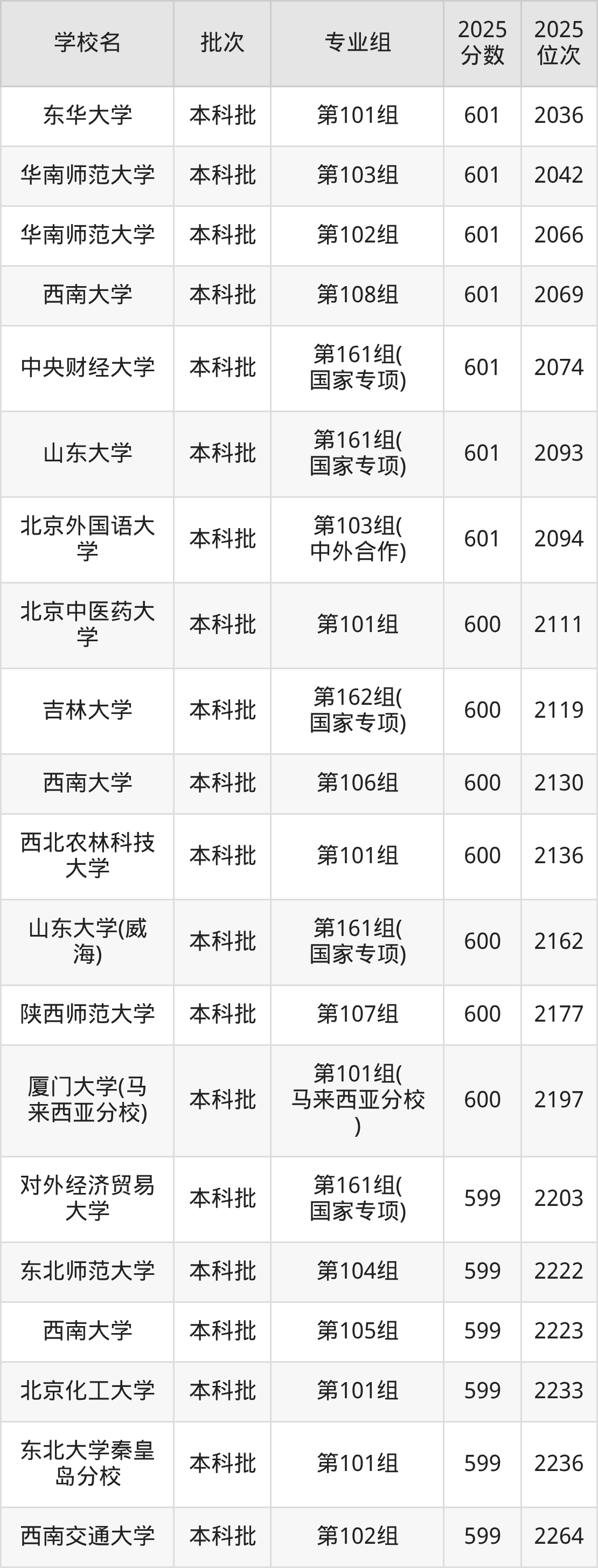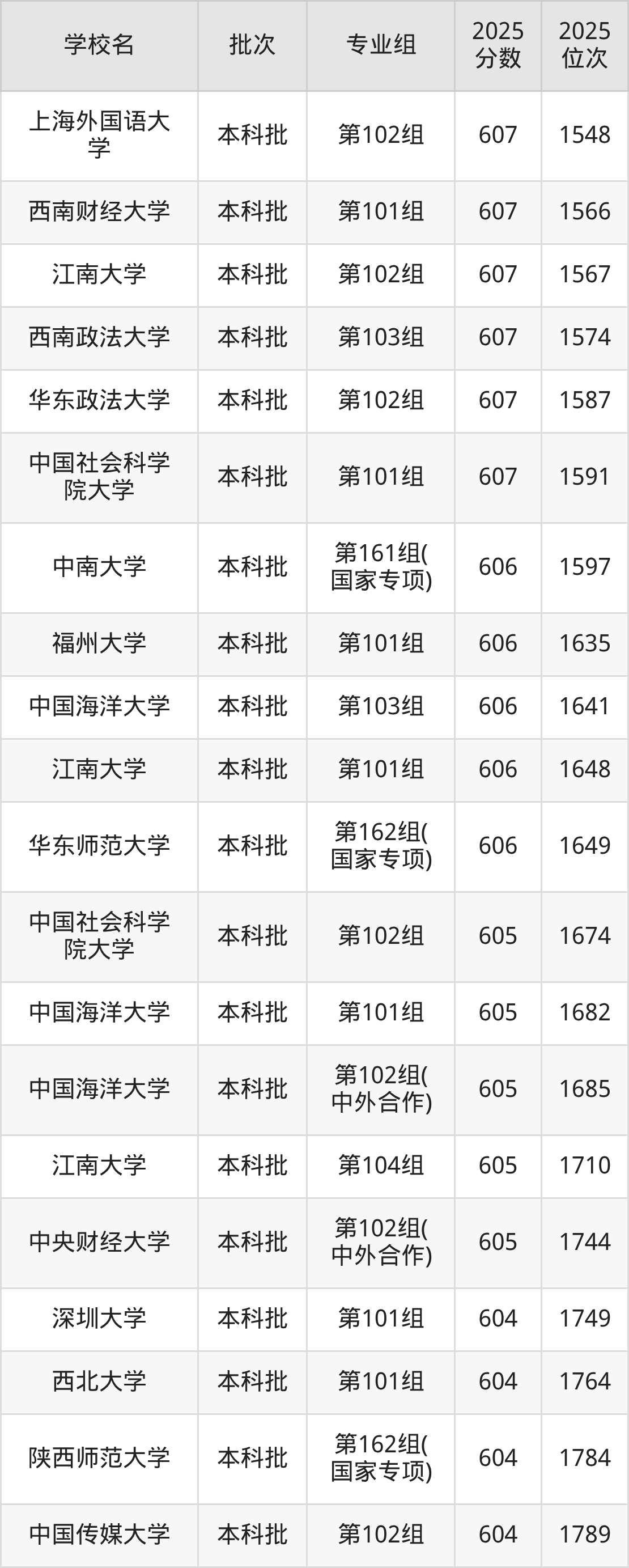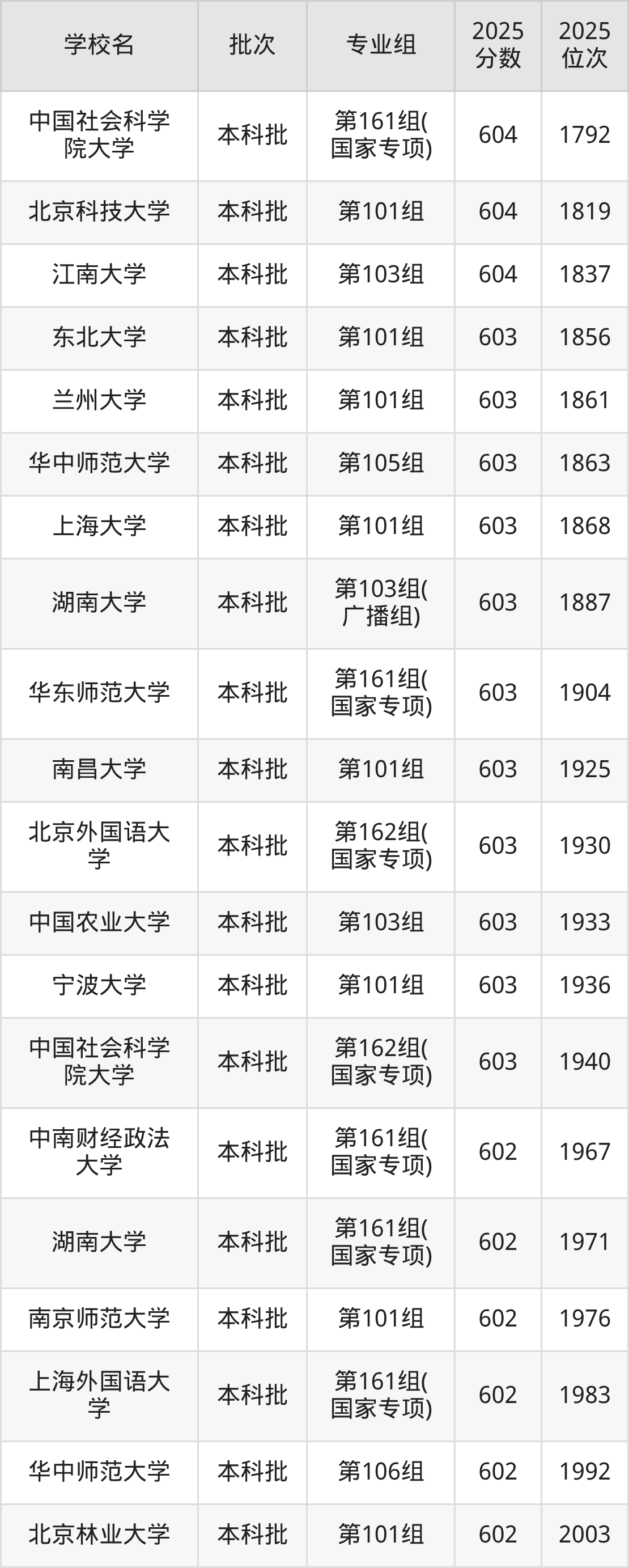 2025年江西高考历史类604分(1747名~1838名)能上的大学有陕西师范大学第162组(国家专项)、北京科技大学第101组、中国传媒大学第102组、中国社会科学院大学第161组(国家专项)等。