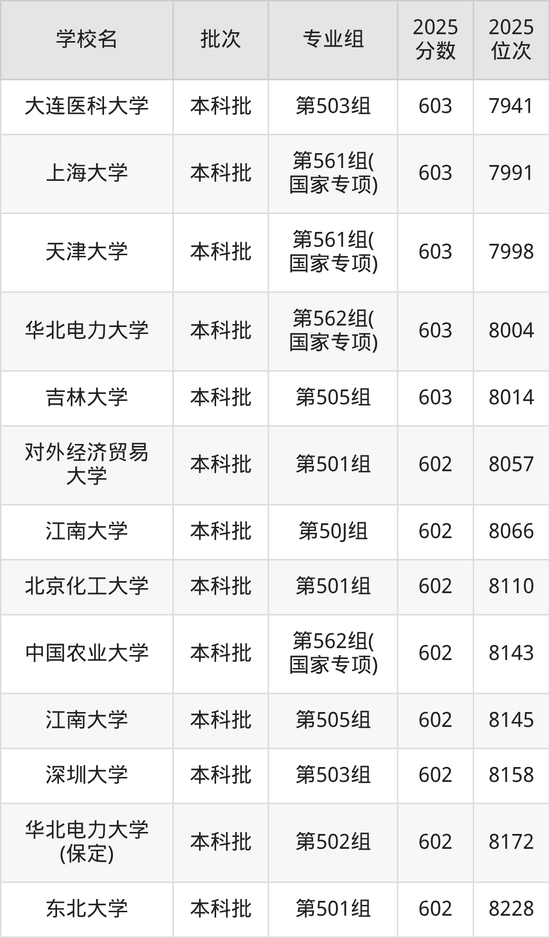 2025年江西高考物理类604分(7443名~7738名)能上的大学有华北电力大学第502组、东北大学第502组、江南大学第50A组、江南大学第50C组等。