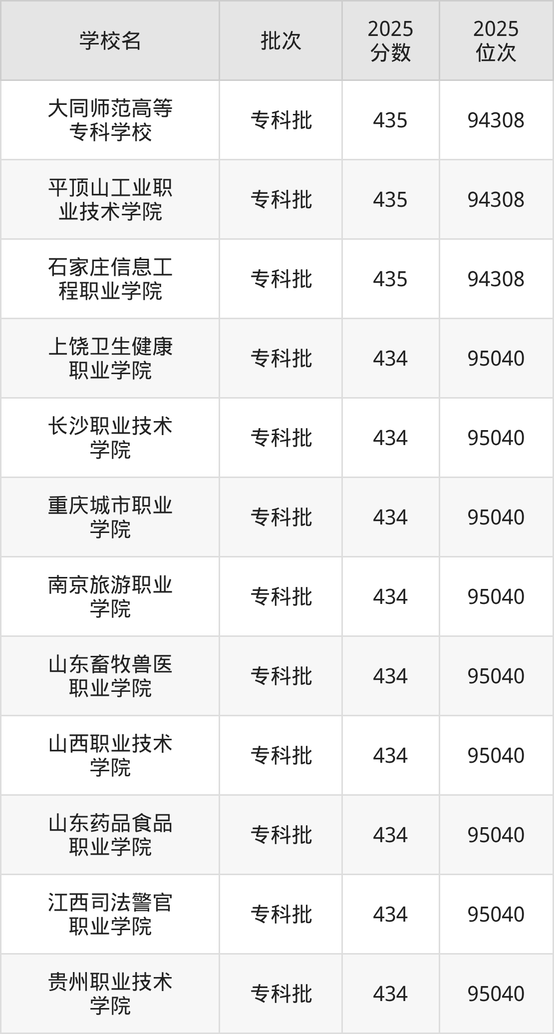 2025年河北高考历史类434分(94309名~95040名)能上的大学有江西司法警官职业学院、山东药品食品职业学院、长沙职业技术学院、上饶卫生健康职业学院等。