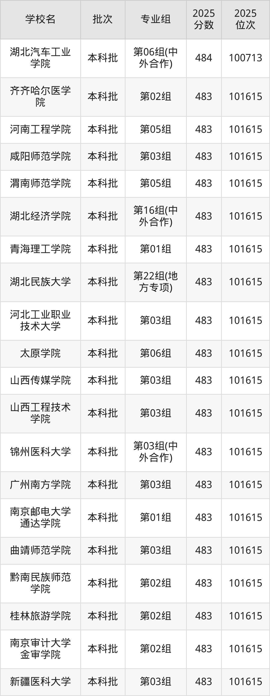 2025年湖北高考物理类483分(100714名~101615名)能上的大学有湖北经济学院第16组(中外合作)、湖北民族大学第22组(地方专项)、河北工业职业技术大学第03组、太原学院第06组等。