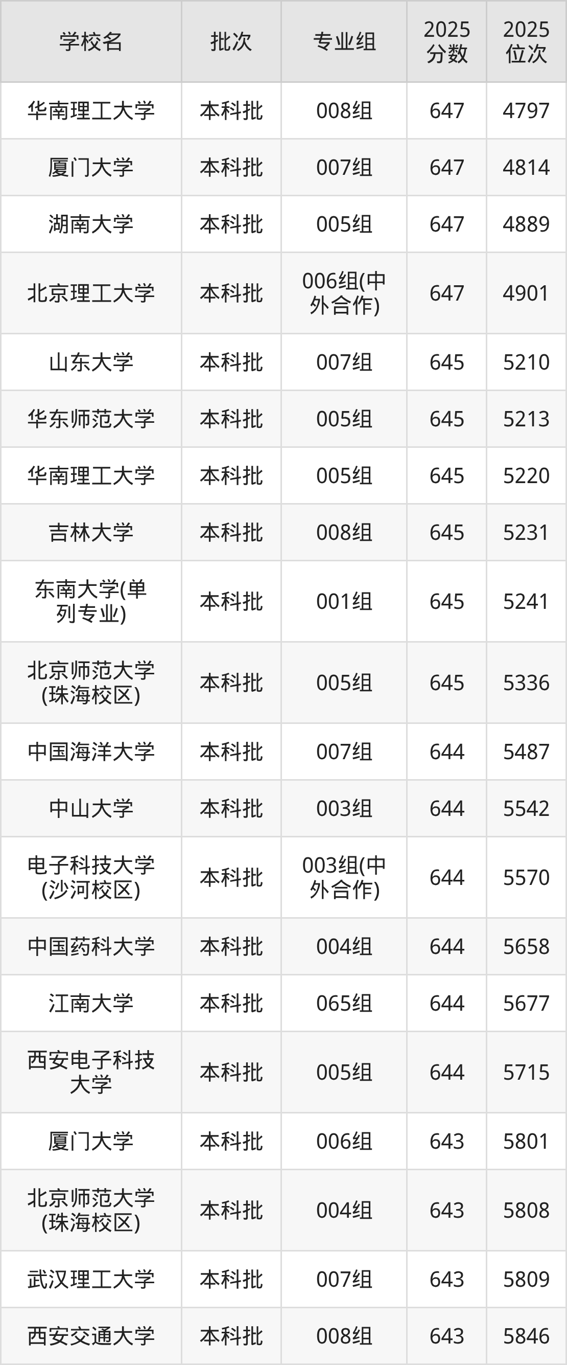 另外录取位次低于该区间(较稳妥)的有中国海洋大学007组(5487名)、中山大学003组(5542名)等;录取位次高于该区间(可冲)的有北京理工大学006组(中外合作)(4901名)、湖南大学005组(4889名)等。