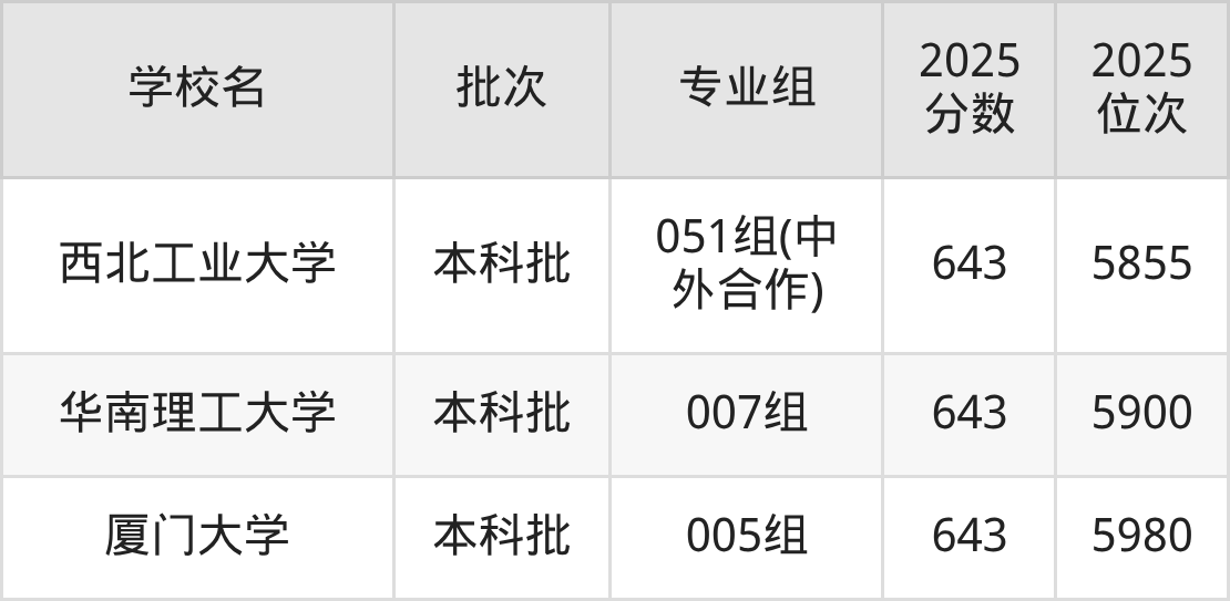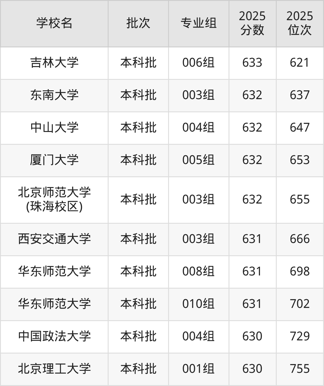 2025年安徽高考历史类645分(243名~263名)录取位次低于该区间(较稳妥)的有武汉大学004组(310名)、北京师范大学003组(336名)等;录取位次高于该区间(可冲)的有南京大学003组(177名)、浙江大学004组(151名)等。