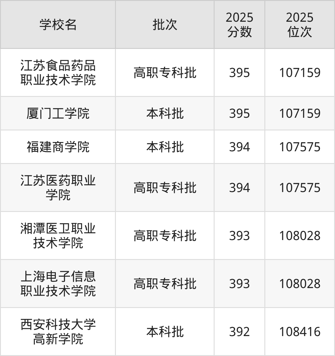 另外录取位次低于该区间(较稳妥)的有西安科技大学高新学院(108416名)、锦州医科大学医疗学院(108833名)等;录取位次高于该区间(可冲)的有江苏医药职业学院(107575名)、福建商学院(107575名)等。