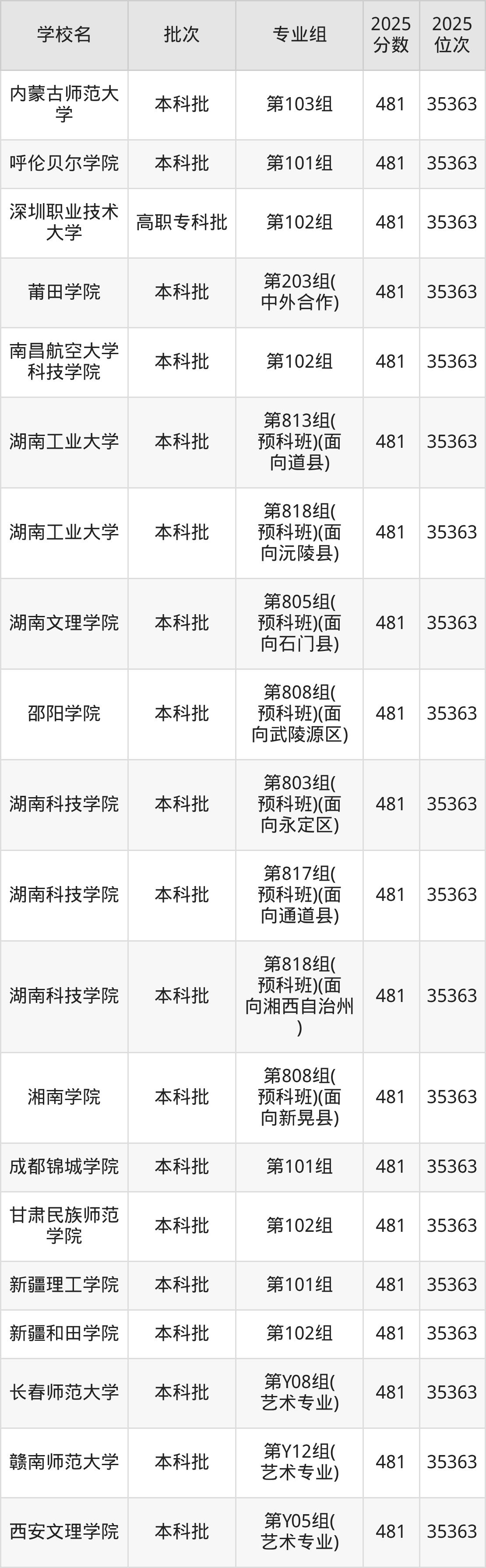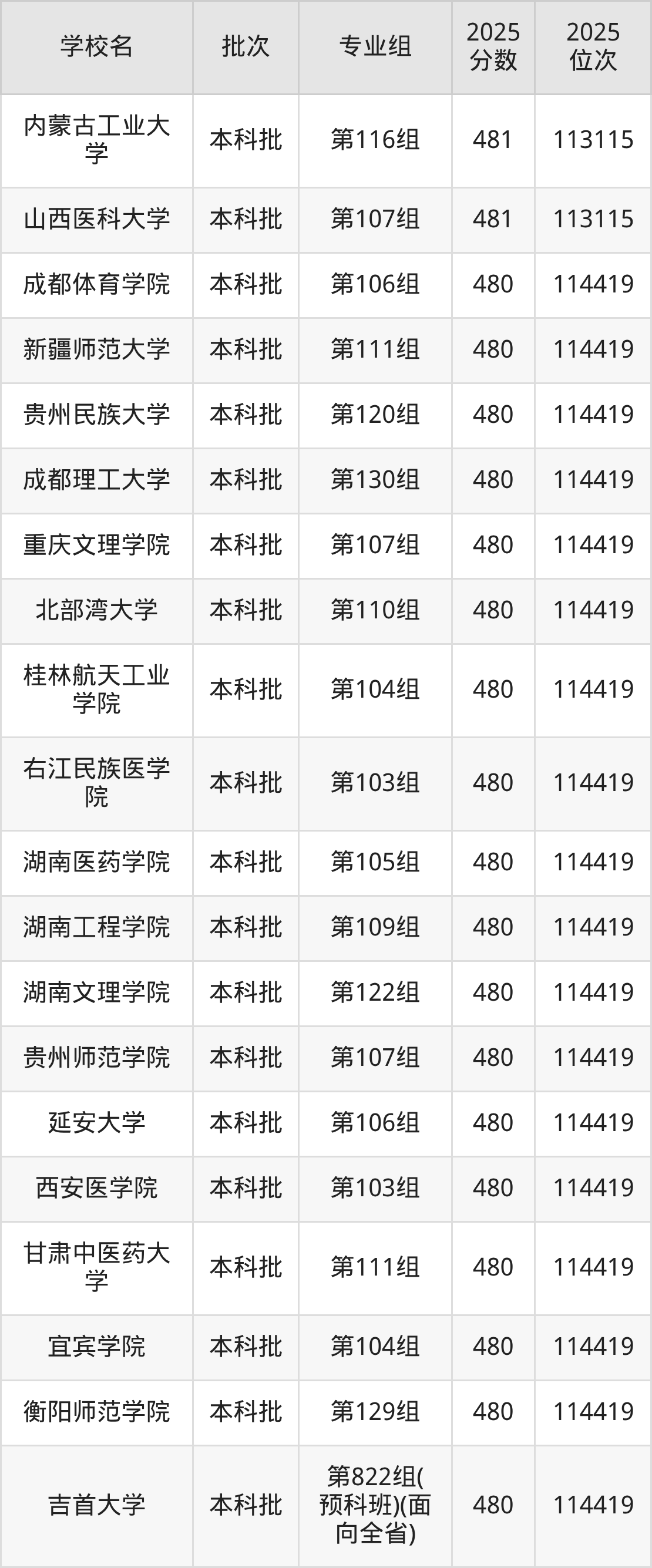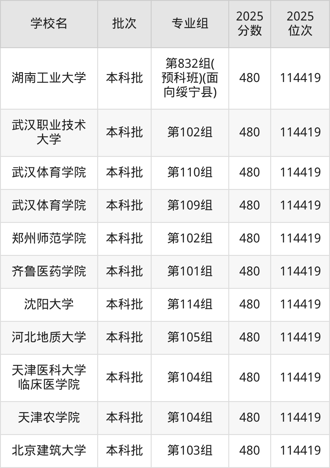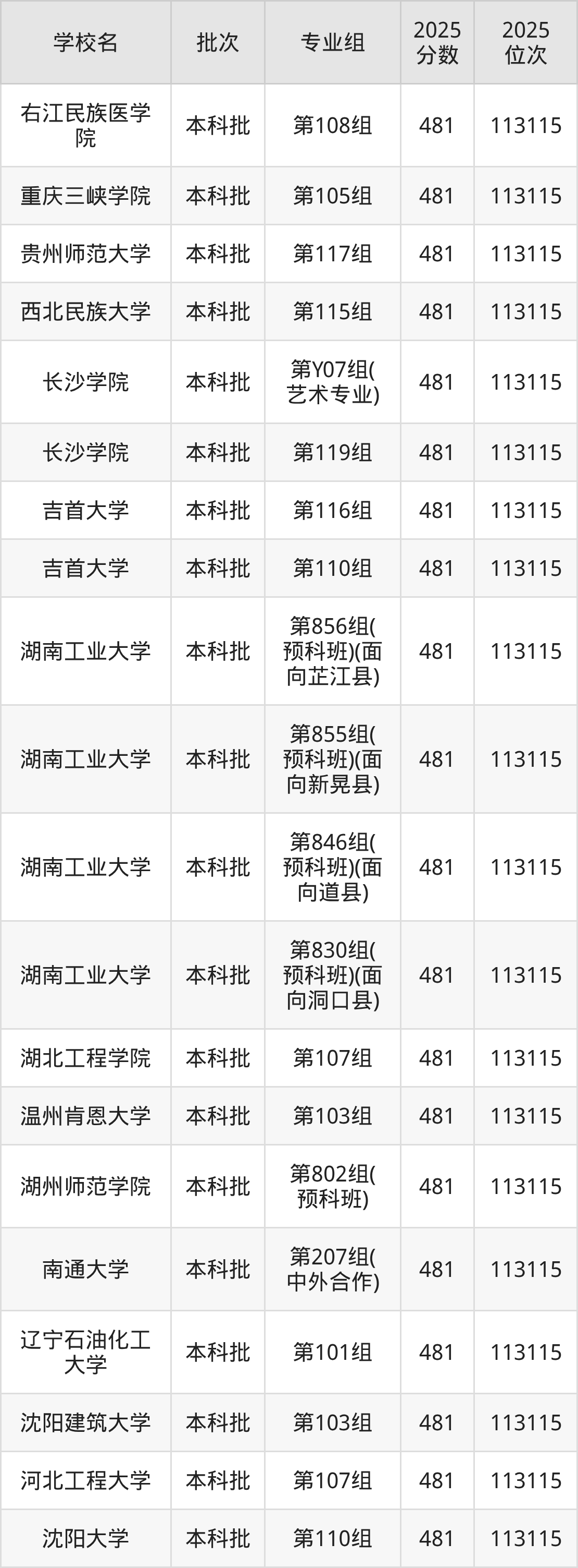 2025年湖南高考物理类480分(113116名~114419名)能上的大学有北京建筑大学第103组、天津农学院第104组、天津医科大学临床医学院第104组、河北地质大学第105组等。