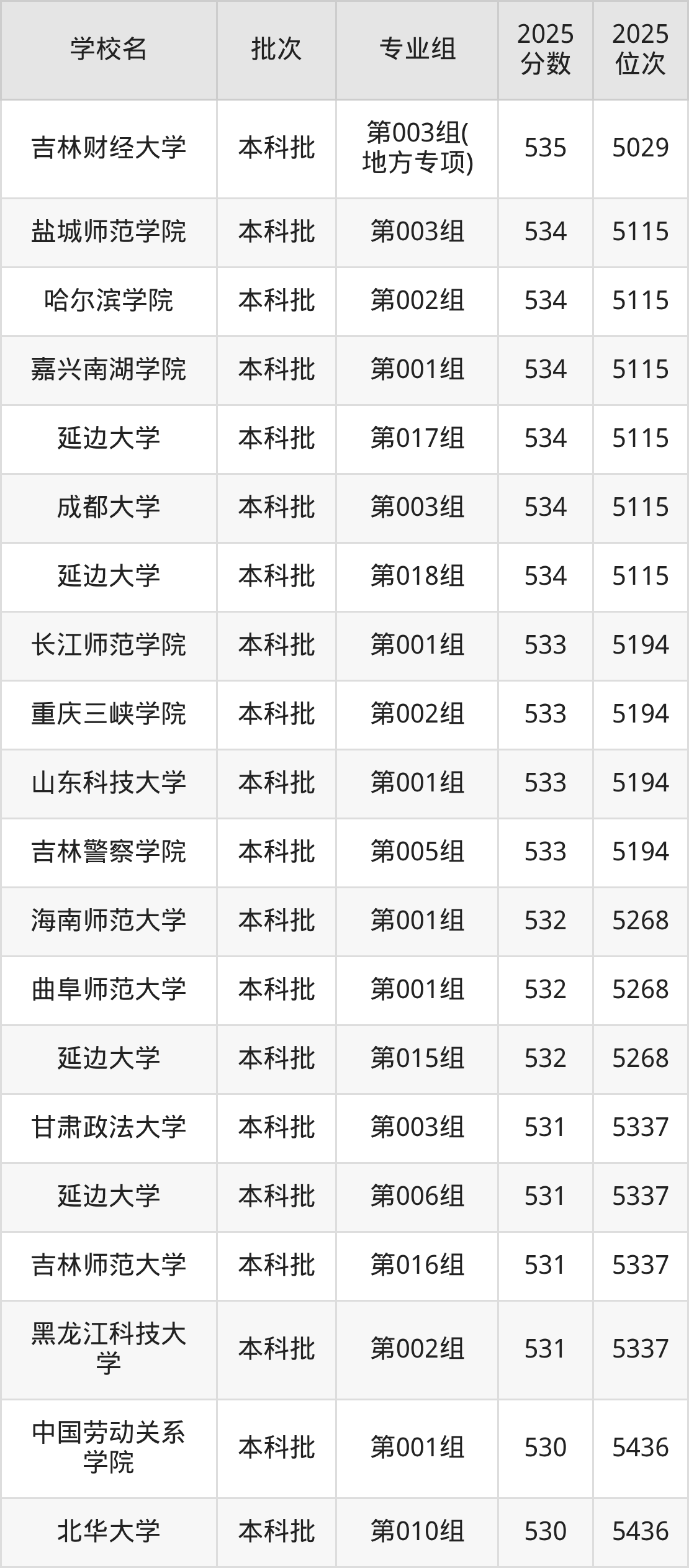 2025年吉林高考历史类533分(5116名~5194名)能上的大学有吉林警察学院第005组、山东科技大学第001组、重庆三峡学院第002组、长江师范学院第001组。