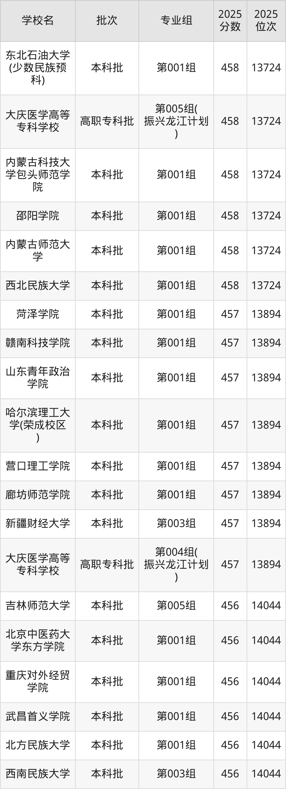 2025年黑龙江高考历史类458分(13560名~13724名)能上的大学有内蒙古科技大学包头师范学院第001组、内蒙古师范大学第001组、许昌学院第001组、邵阳学院第001组等。