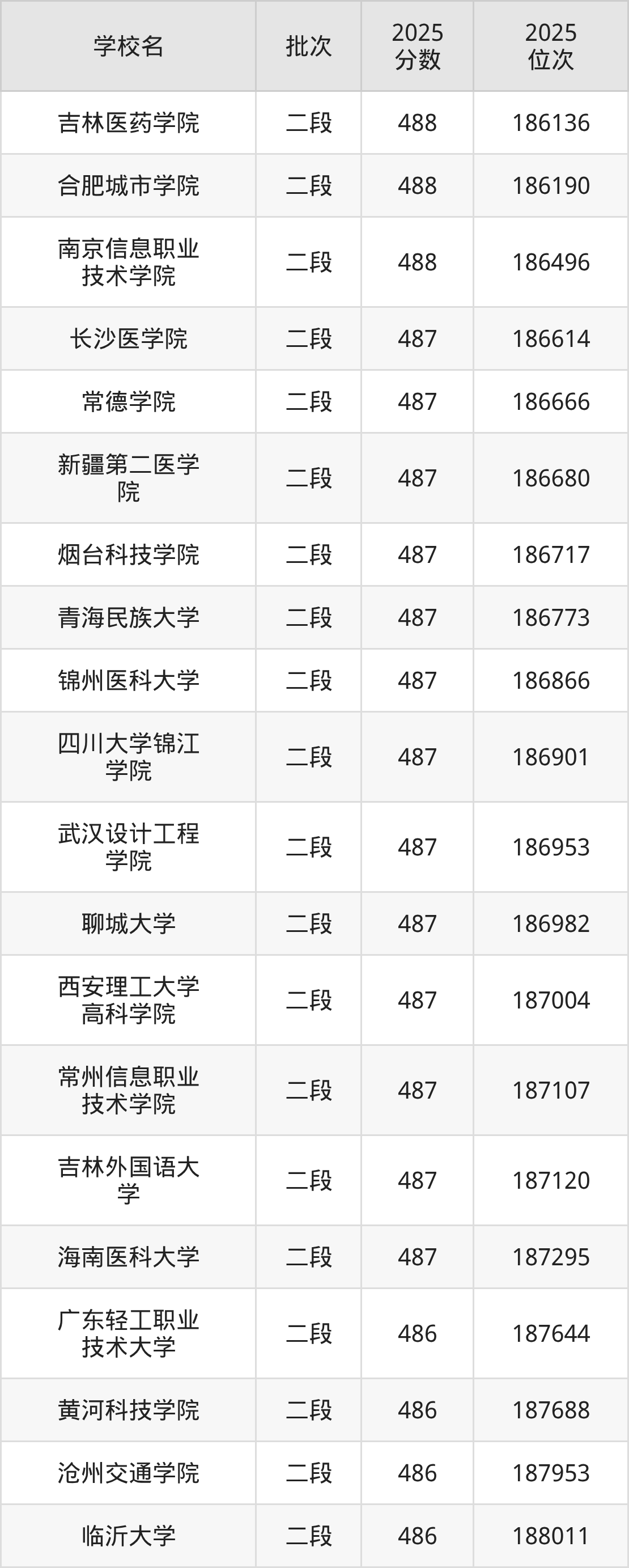 这些都是2026年高考186577名~187636名考生可以报考的大学,更多学校名单如下表所示: