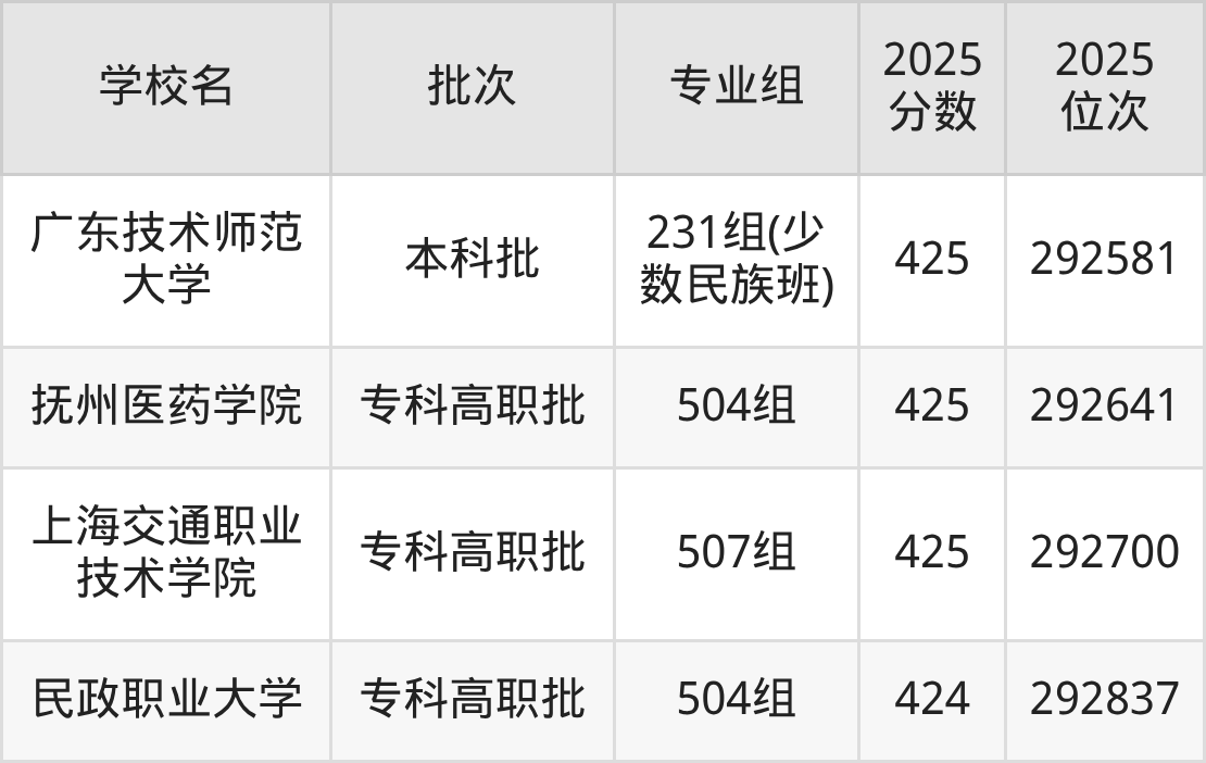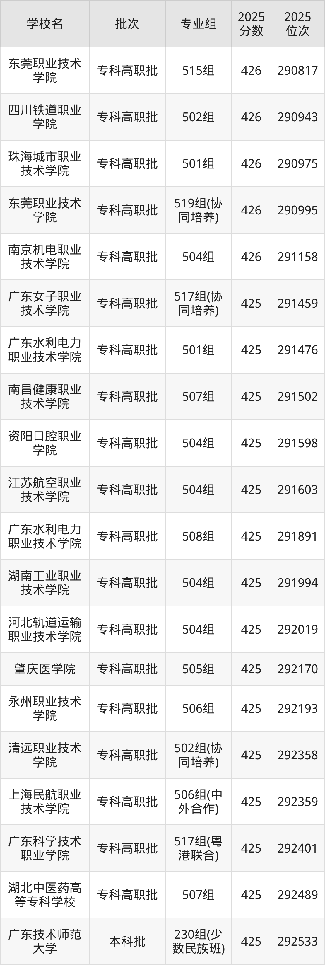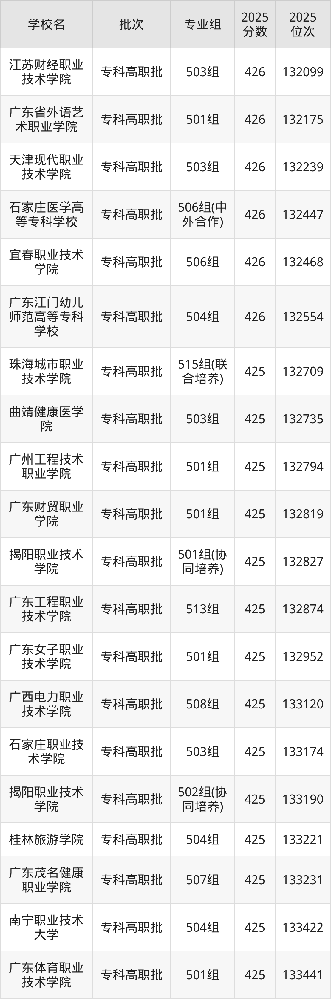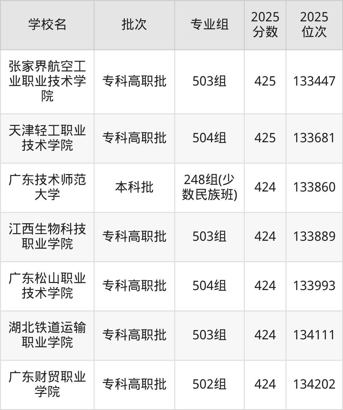 2025年广东高考历史类425分(132595名~133714名)能上的大学有石家庄职业技术学院503组、南宁职业技术大学504组、桂林旅游学院504组、广东体育职业技术学院501组等。