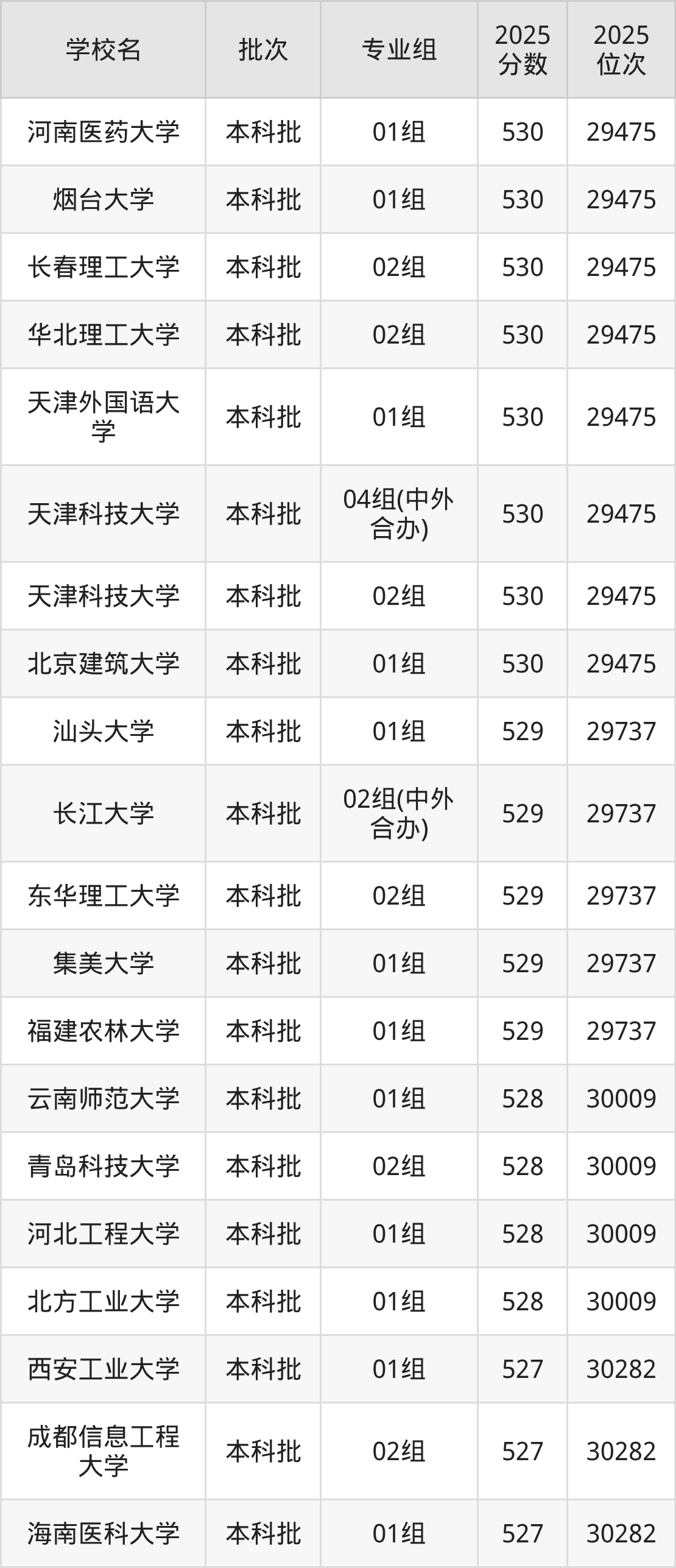 2025年北京高考528分(29738名~30009名)能上的大学有北方工业大学01组、河北工程大学01组、青岛科技大学02组、云南师范大学01组。