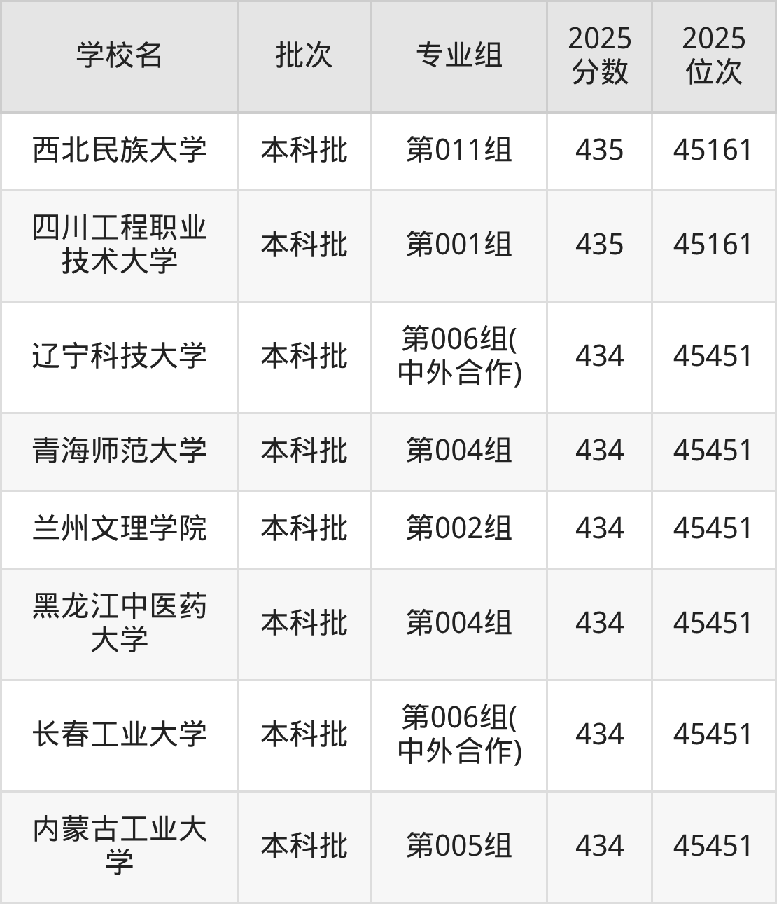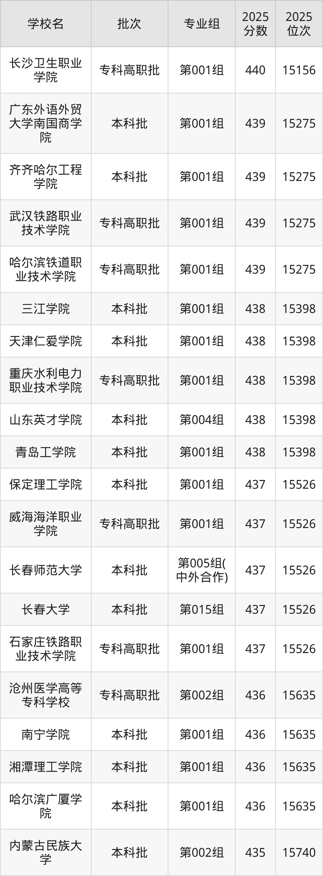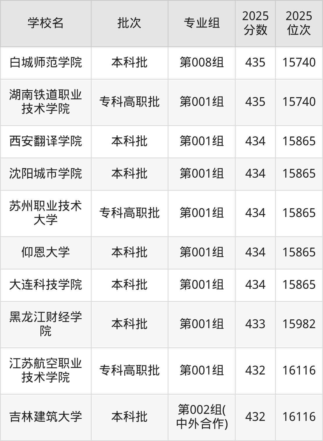 2025年吉林高考历史类435分(15636名~15740名)能上的大学有内蒙古民族大学第002组、白城师范学院第008组、湖南铁道职业技术学院第001组。