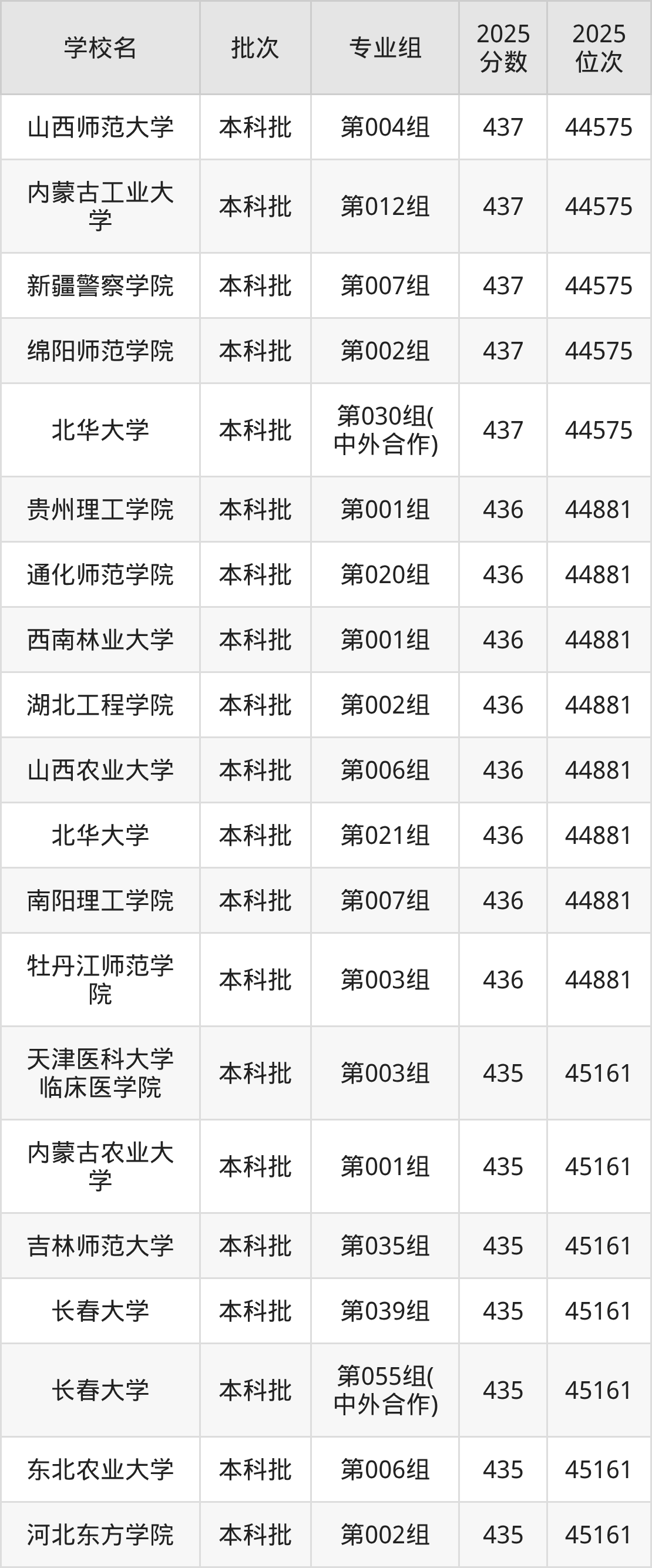 2025年吉林高考物理类435分(44882名~45161名)能上的大学有天津医科大学临床医学院第003组、河北东方学院第002组、内蒙古农业大学第001组、吉林师范大学第035组等。