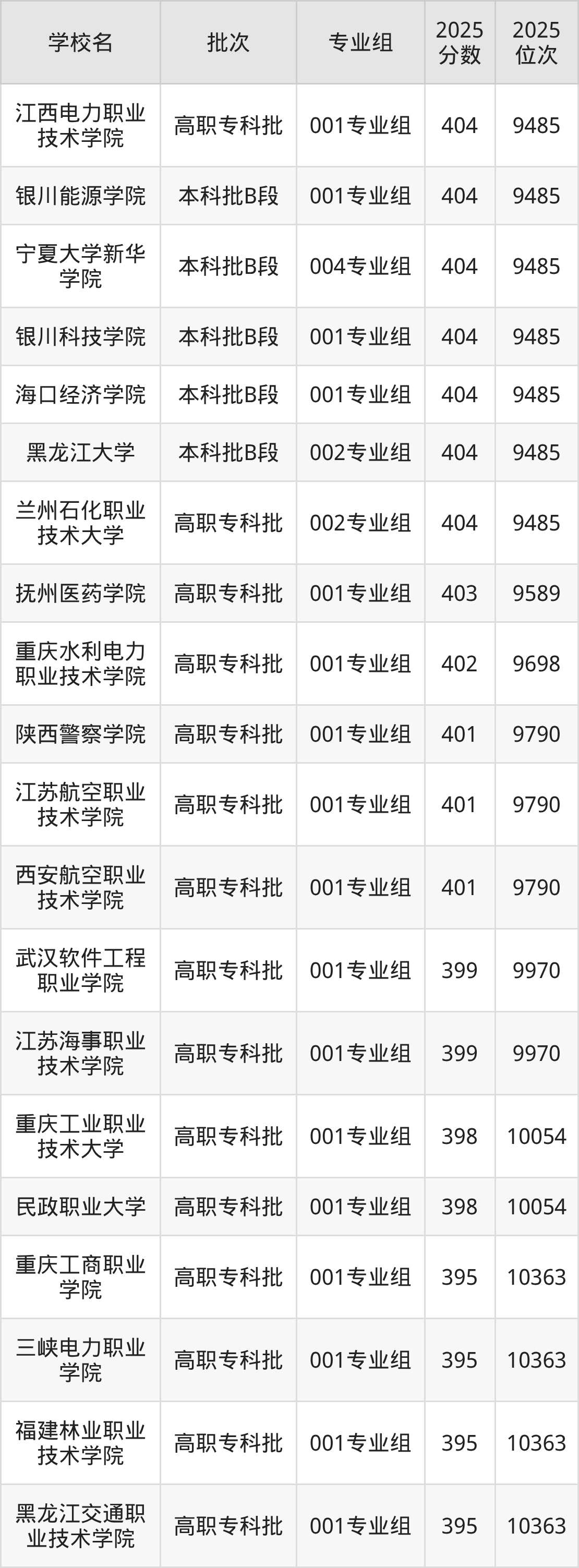 2025年宁夏高考历史类398分(9971名~10054名)能上的大学有民政职业大学001专业组、重庆工业职业技术大学001专业组。