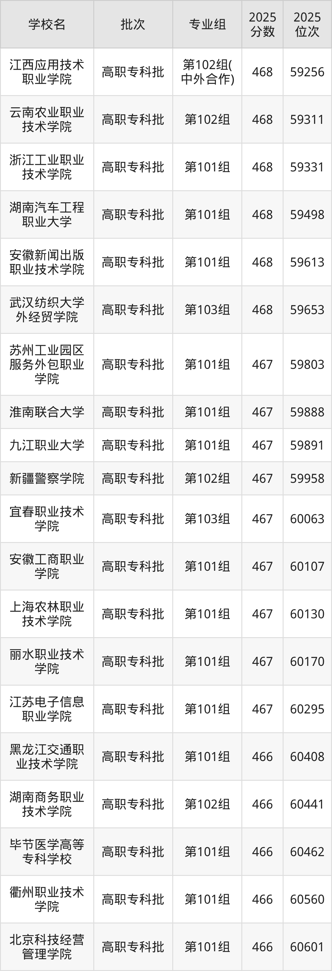 2025年江西高考历史类467分(59713名~60360名)能上的大学有新疆警察学院第102组、苏州工业园区服务外包职业学院第101组、淮南联合大学第101组、上海农林职业技术学院第101组等。
