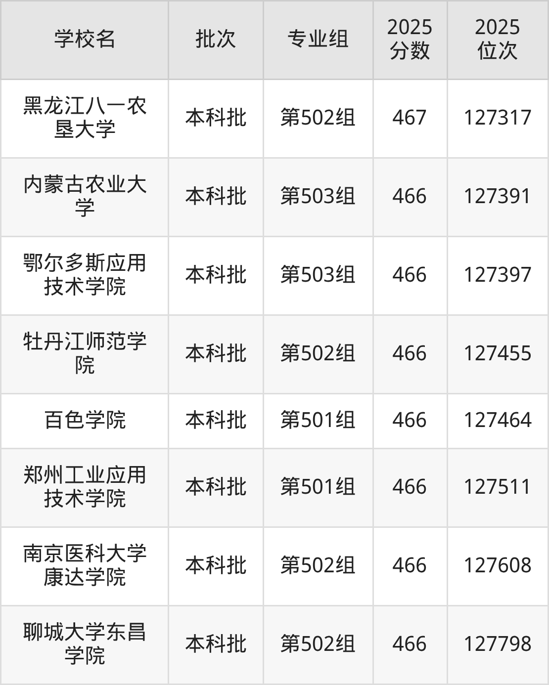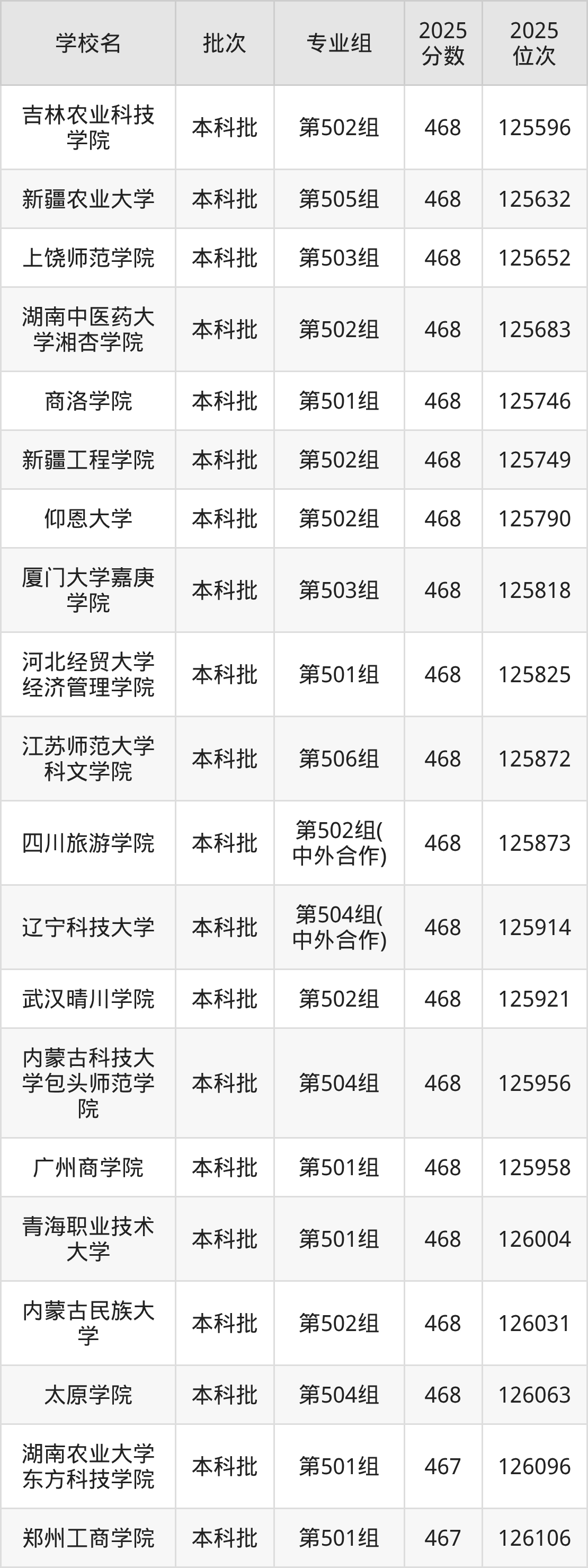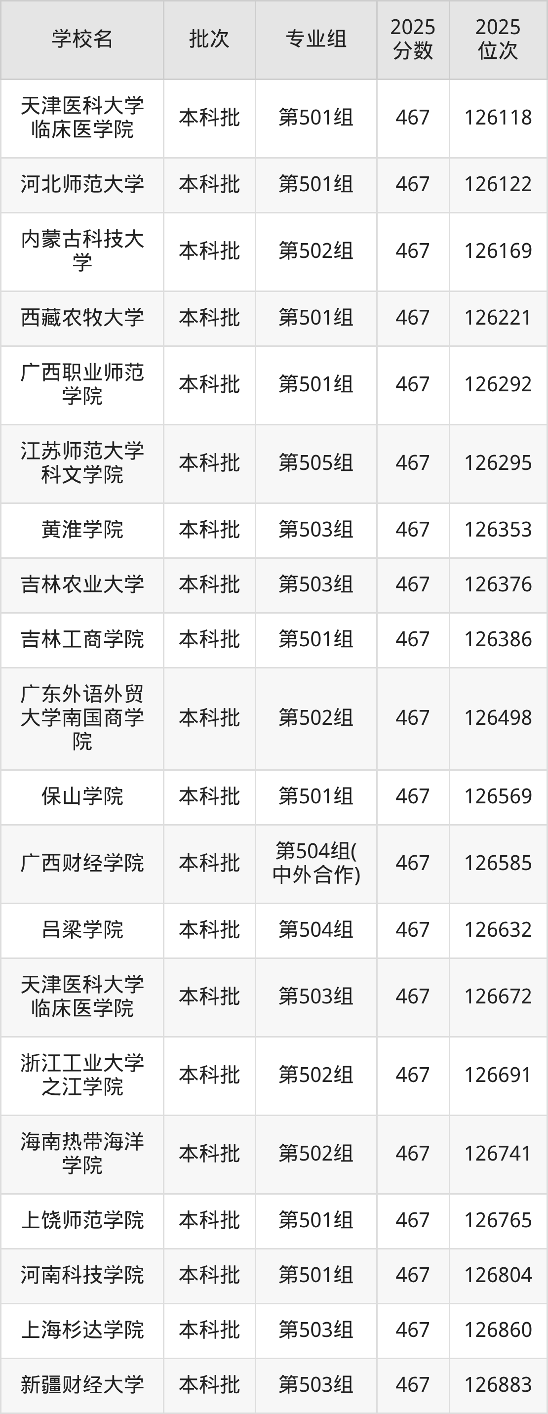 2025年江西高考物理类467分(126089名~127347名)能上的大学有河北师范大学第501组、辽宁师范大学第501组、天津农学院第503组、山西农业大学第502组等。