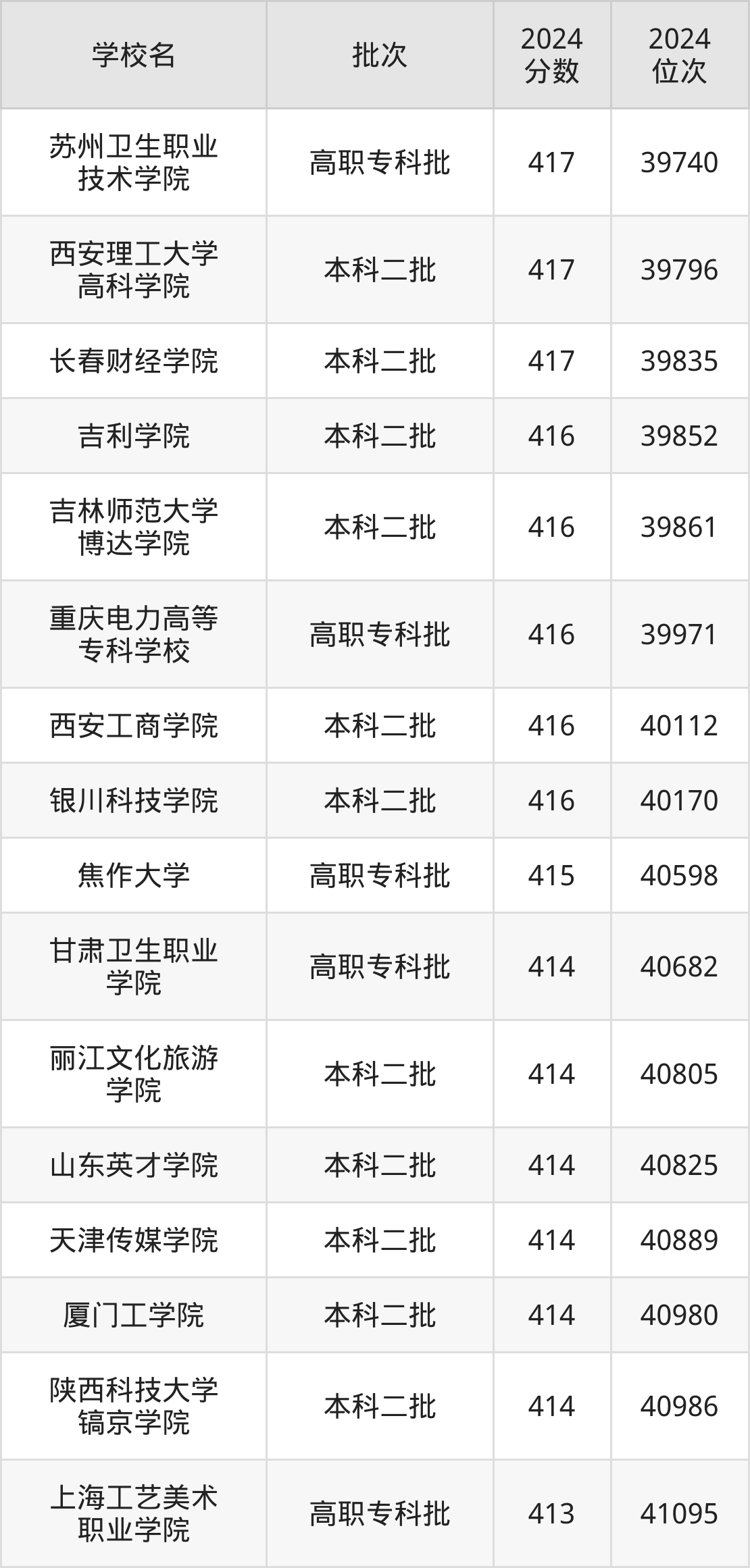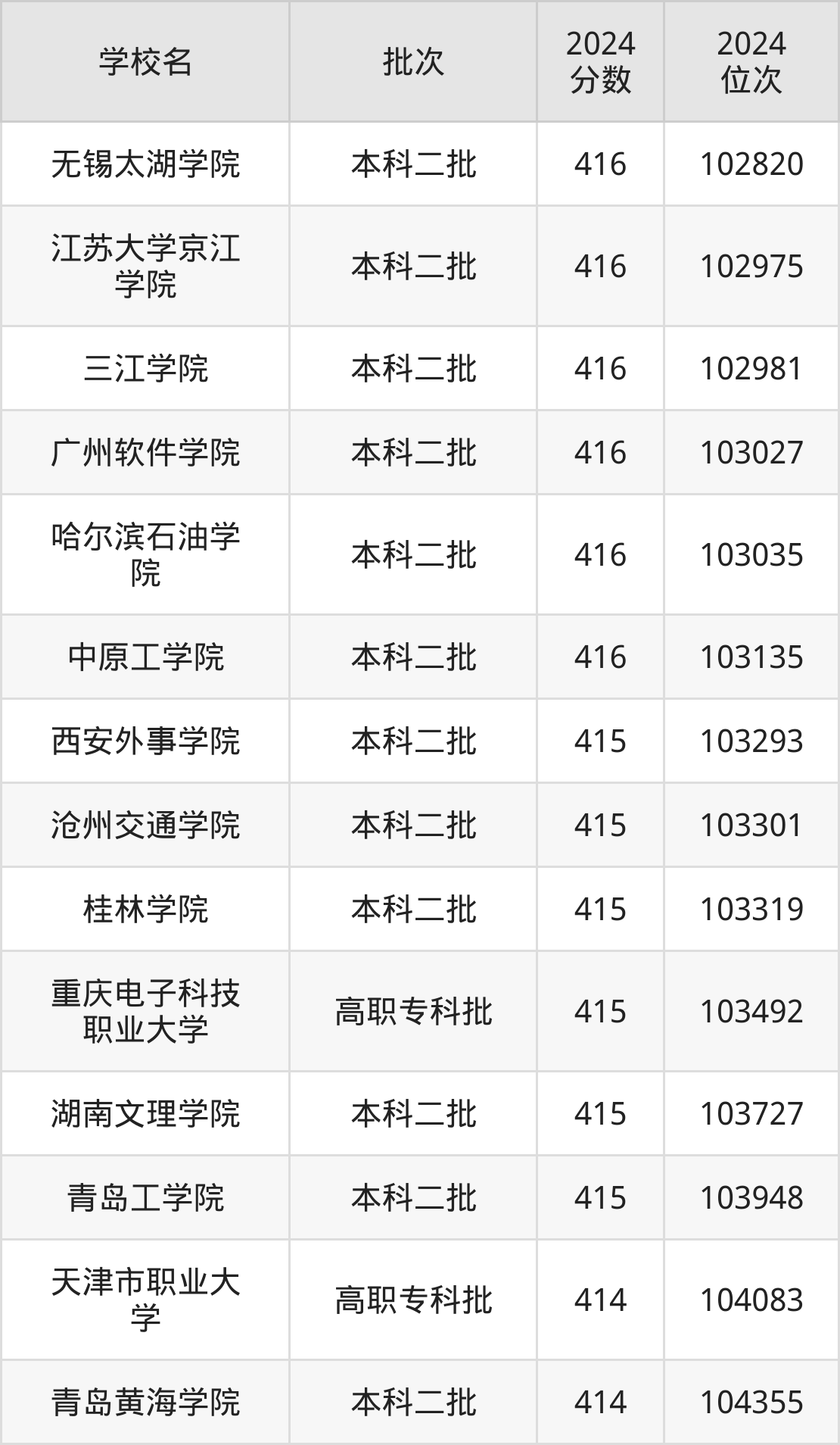 2024年陕西高考理科415分(103279名~104017名)能上的大学有沧州交通学院、青岛工学院、湖南文理学院、桂林学院等。