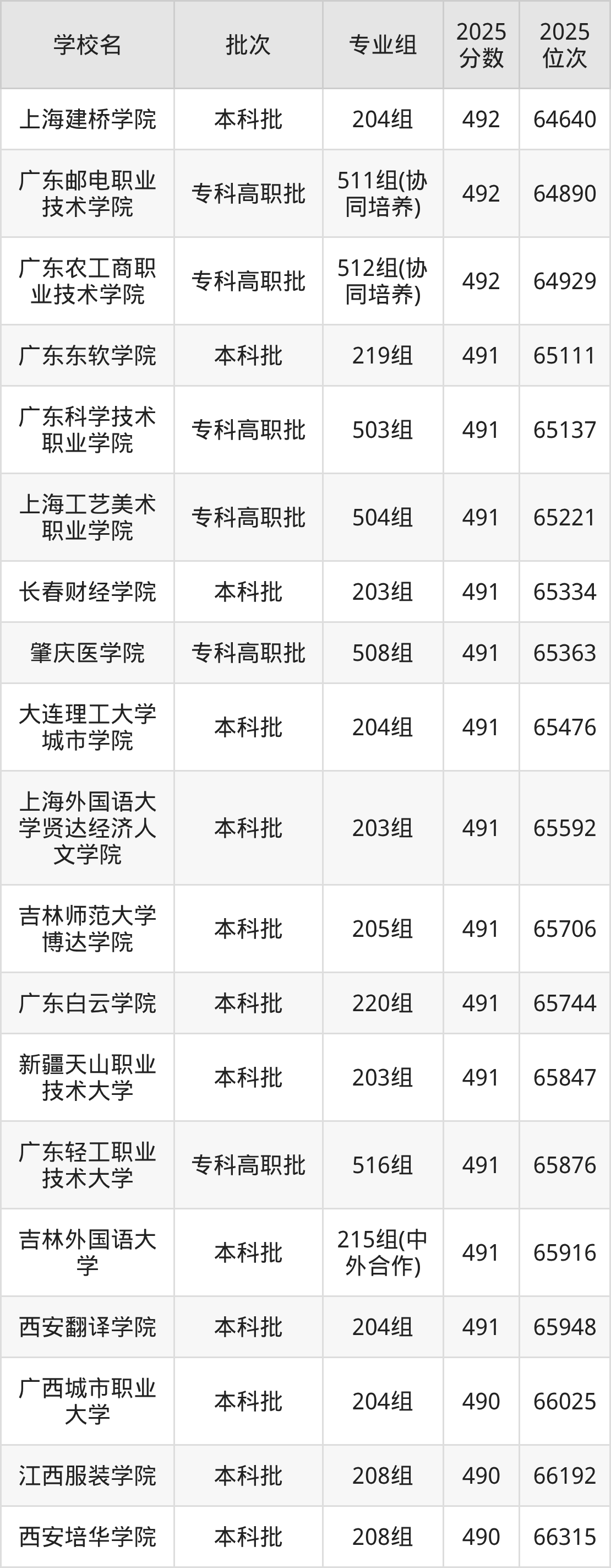 2025年广东高考历史类491分(65099名~65974名)能上的大学有广东白云学院220组、吉林外国语大学215组(中外合作)、广东东软学院219组、西安翻译学院204组等。