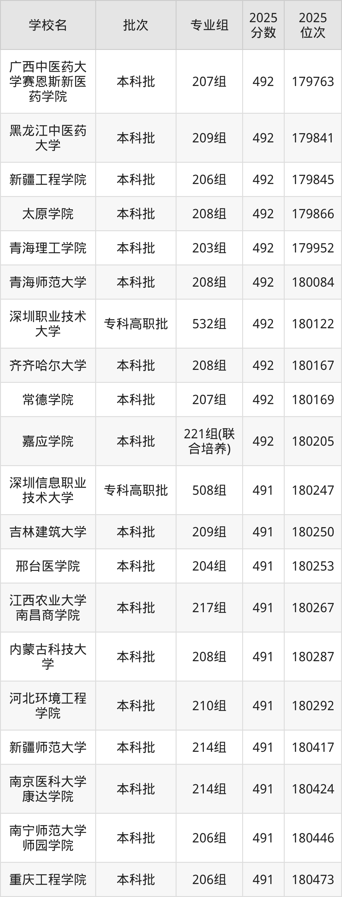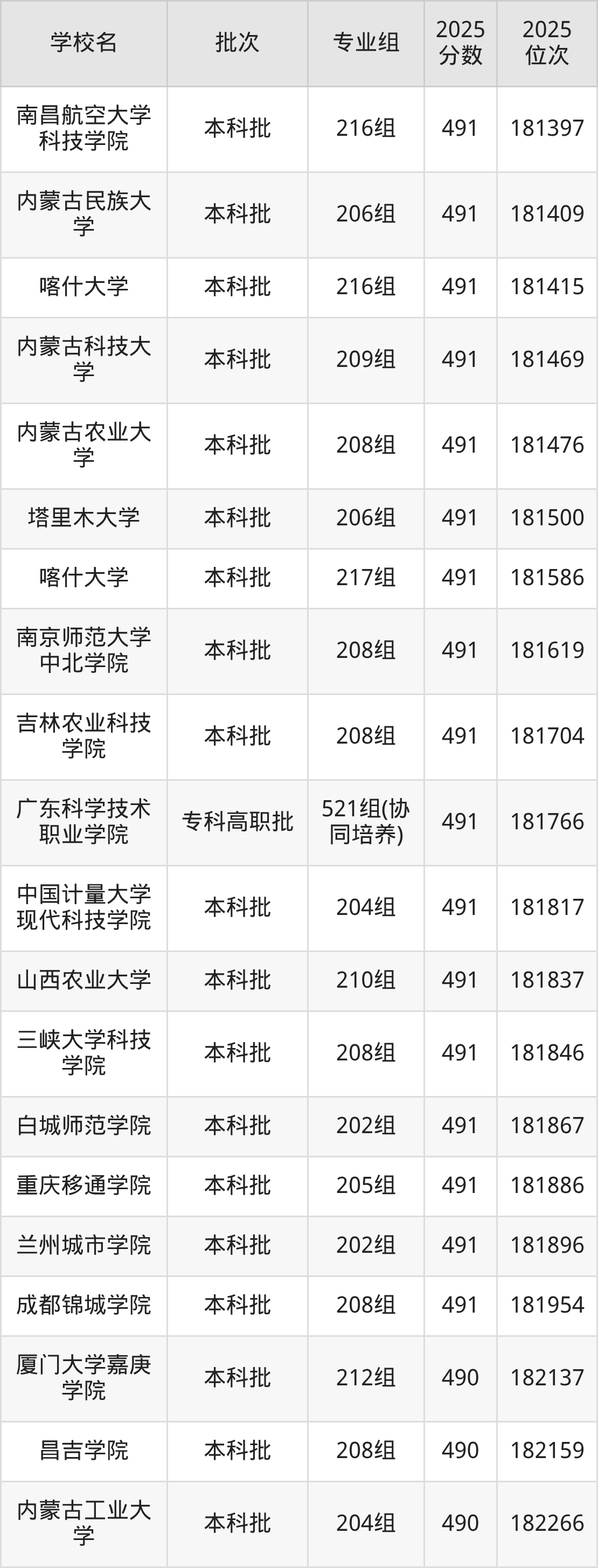 2025年广东高考物理类491分(180219名~181963名)能上的大学有山西农业大学210组、内蒙古科技大学208组、内蒙古科技大学209组、内蒙古农业大学208组等。