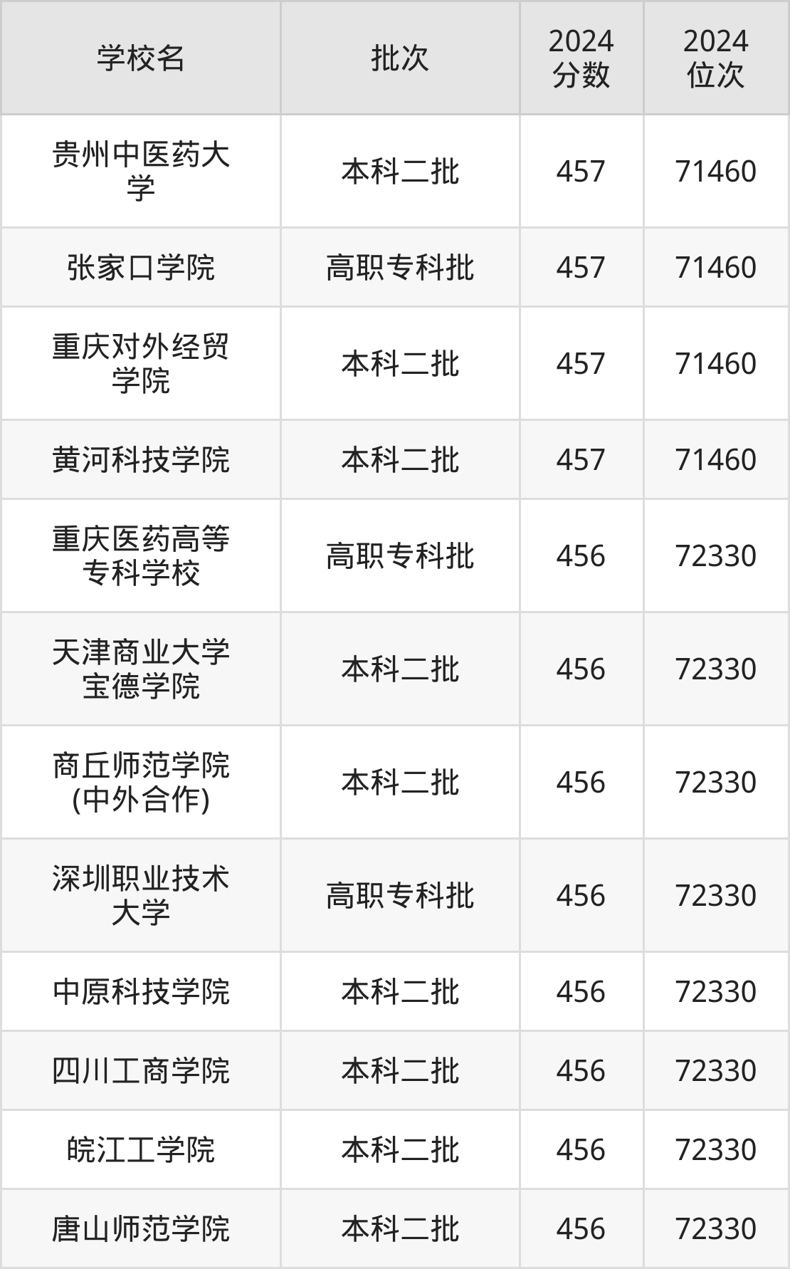 2024年河南高考文科456分(71461名~72330名)能上的大学有唐山师范学院、天津商业大学宝德学院、四川工商学院、中原科技学院等。