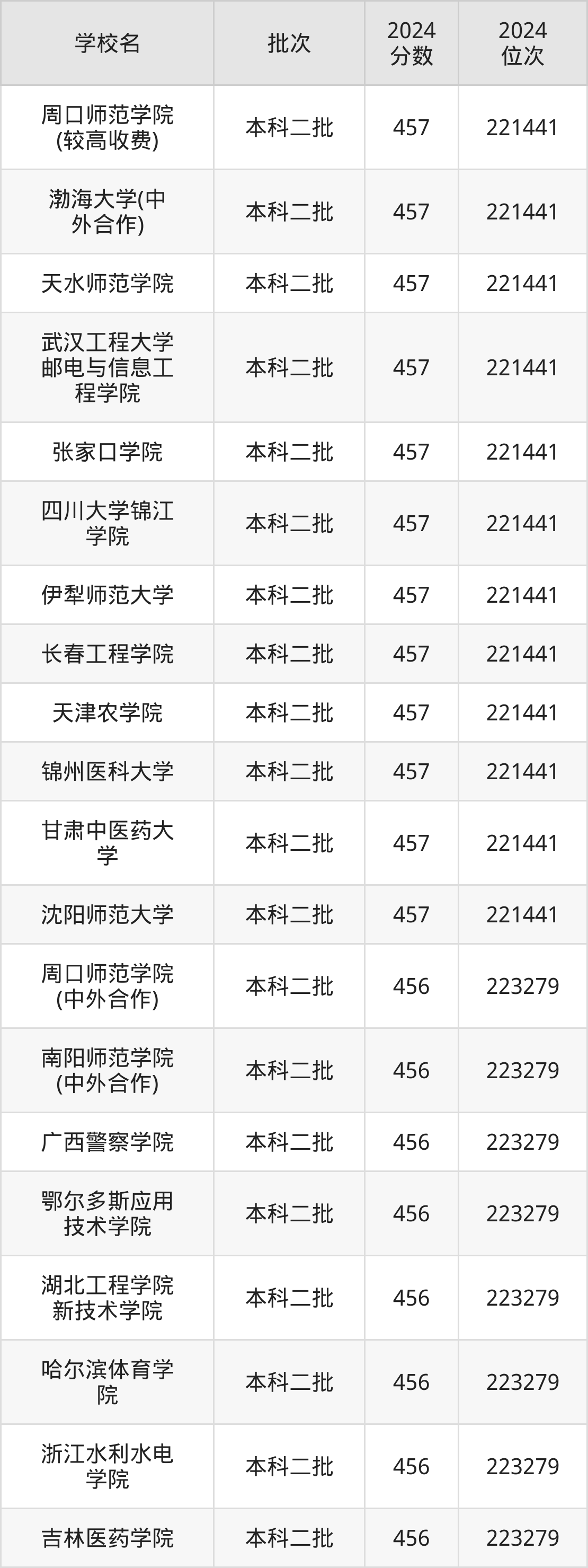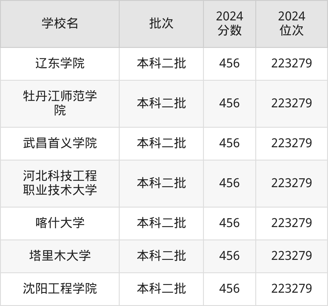 2024年河南高考理科456分(221442名~223279名)能上的大学有沈阳工程学院、塔里木大学、喀什大学、河北科技工程职业技术大学等。