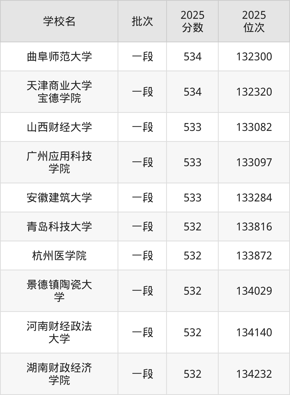 这些都是2026年高考132626名~133791名考生可以报考的大学,更多学校名单如下表所示: