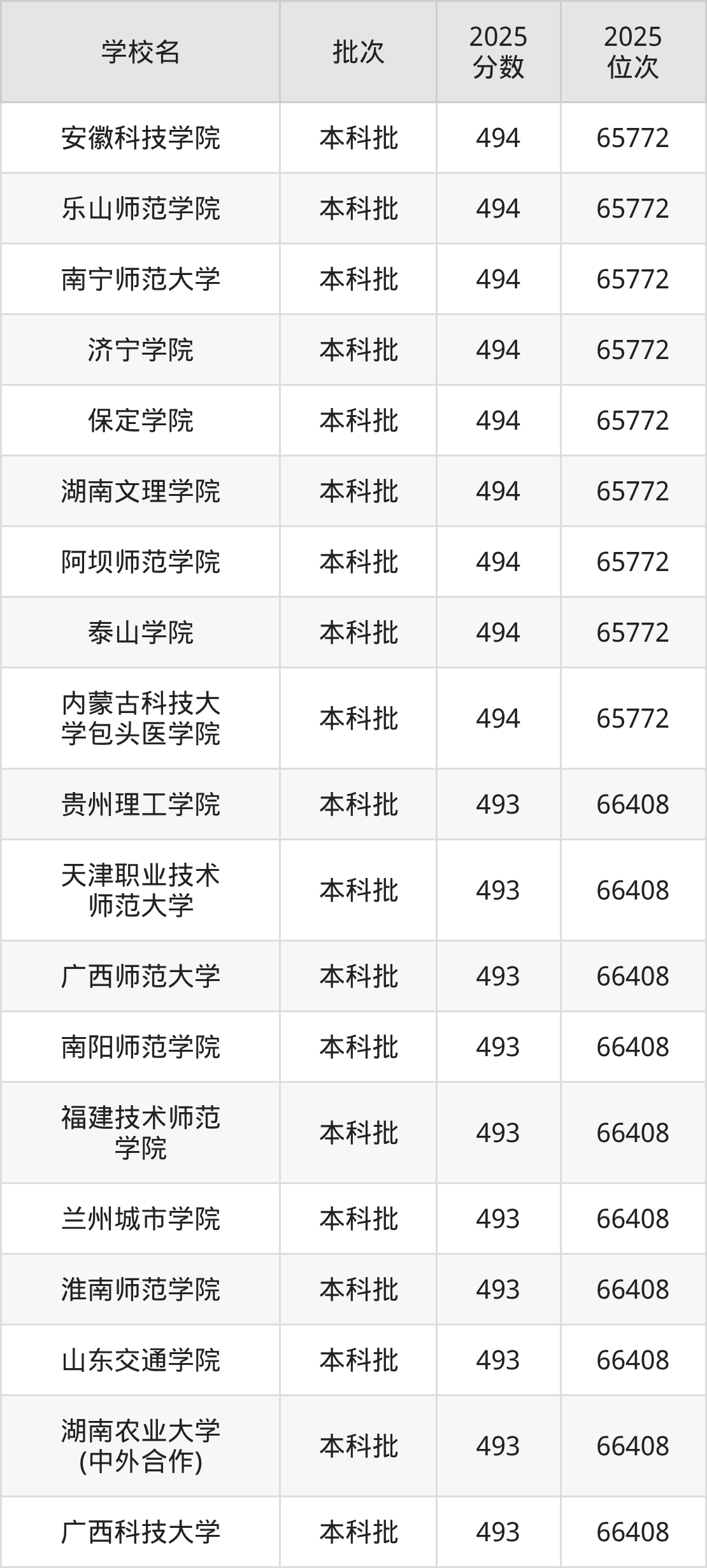 2025年重庆高考物理类493分(65773名~66408名)能上的大学有淮南师范学院、福建技术师范学院、贵州理工学院、天津职业技术师范大学等。