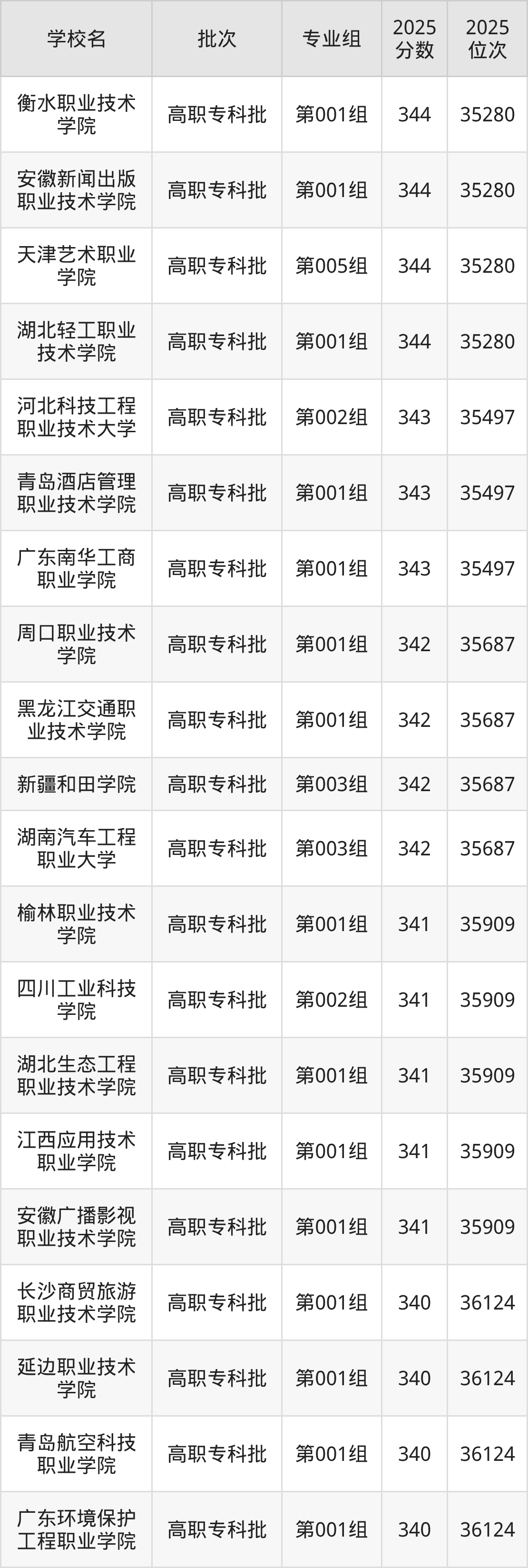 另外录取位次低于该区间(较稳妥)的有广东环境保护工程职业学院第001组(36124名)、长沙商贸旅游职业技术学院第001组(36124名)等;录取位次高于该区间(可冲)的有黑龙江交通职业技术学院第001组(35687名)、新疆和田学院第003组(35687名)等。